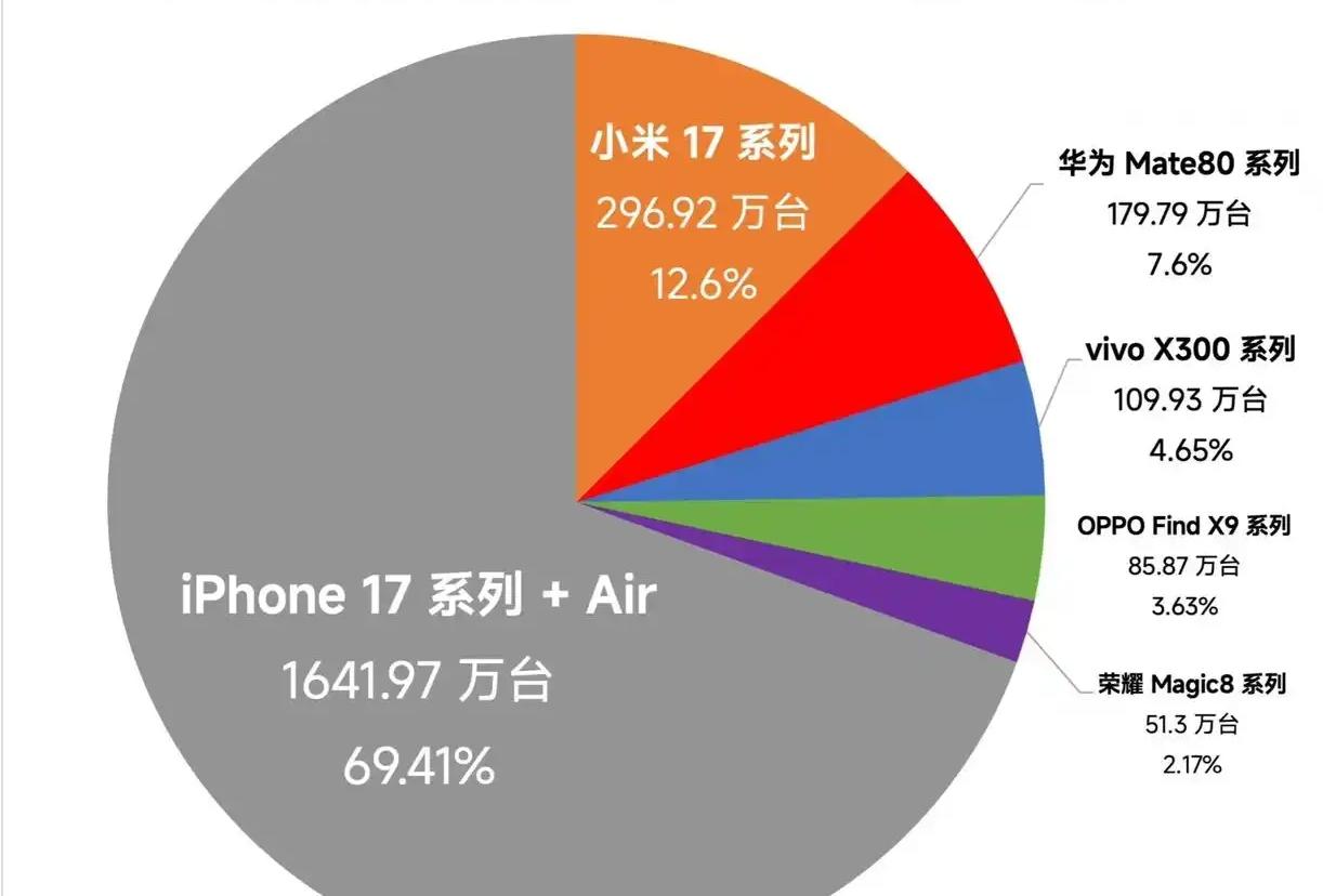 苹果手机遥遥领先。 新年伊始,各大手机品牌纷纷发力。大家知道,国产手机以华为小米ov四家销量最好,但这四家加起来也不如苹果17。 苹果17为什么销售这么好?原因很简单,漂亮好用好便宜。 苹果17现在只要5000元,比以平价著称的小米也差不多。 那么在差不多价格的情况下怎么选呢?看看图就知道消费者的选择了。 想当年,华为是多火,然后就开始涨价。小米粉丝多了以后,也开始涨价。而苹果选择的是降价。 你准备换手机吗?会买哪个牌子的? 苹果17