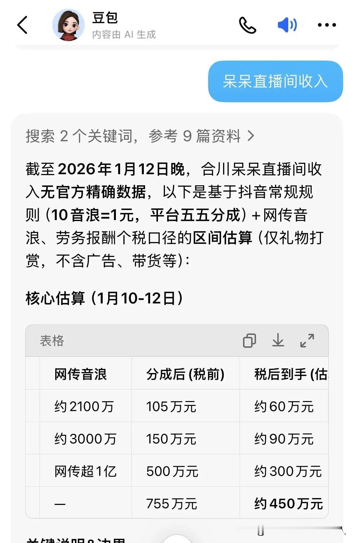 合川呆呆这三天到底赚了多少?没有官方准确数据,但结合网传音浪和平台规则,能算出个大概情况。 她的收入主要靠粉丝打赏(含音浪),这三天直播热度爆棚——观看人数常破10万,高峰期达60万,12日两场直播累计观看超1.2亿,满屏都是昂贵礼物。按抖音常规五五分成、扣税后估算,10日约2100万音浪到手63万,11日3000万音浪到手90万,12日网传破1亿音浪到手300万,三天打赏税后合计约453万元(非官方数据)。 目前她没接广告、不带货,暂时没有这部分收入,但粉丝从几百暴涨到上百万,账号后续商业价值可期。 不过说“彻底躺平”有点绝对,这波热度是意外也是机遇,若能稳住真实接地气的风格,合规运营、合理转化流量,才能让收益更长久。