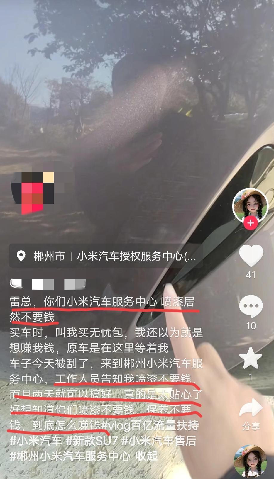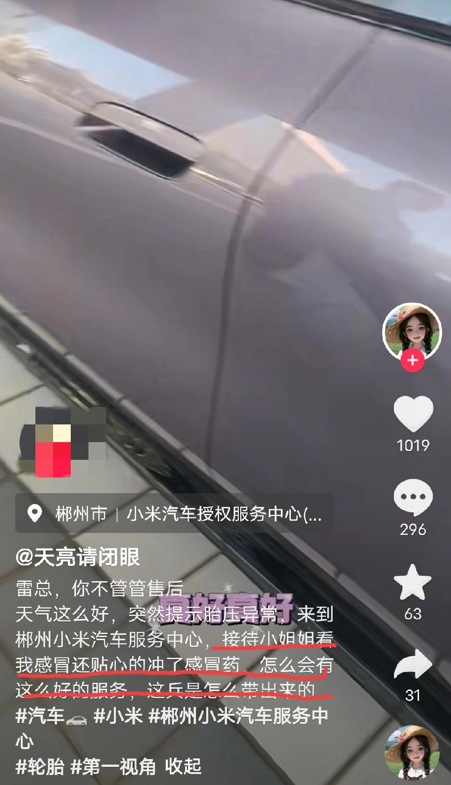 湖南郴州。小米女车主发视频称:小米售后的接待小姐姐真的太贴心,看我感冒还贴心的冲了感冒药,雷总,这兵你是怎么带出来的? 看了这位车主的账号主页,就两个视频,另外一个也是讲小米汽车的,是这么说的:小米汽车服务中心,喷漆居然不用钱。雷总,你们喷漆不用钱,保养不用钱,到底靠什么赚钱啊? …… 网友评论:不是说小米汽车的客户群体都是高知群体吗?我咋看不出来呢?联想到近段时间小米的风评有所好转,我好像知道为什么了? 评论区诸君,你们怎么看?