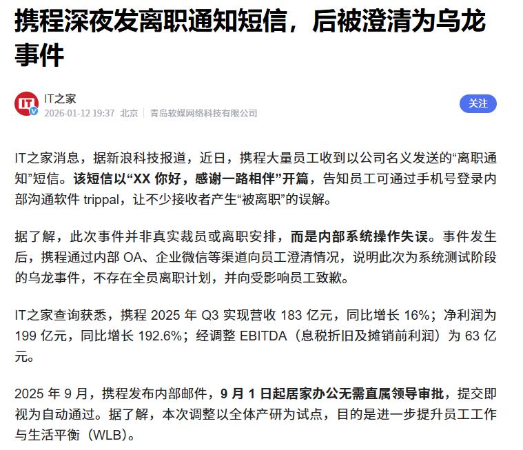 关于打工人究竟能捅多大篓子这件事,或许这位误发离职通知短信的携程员工有话要讲......