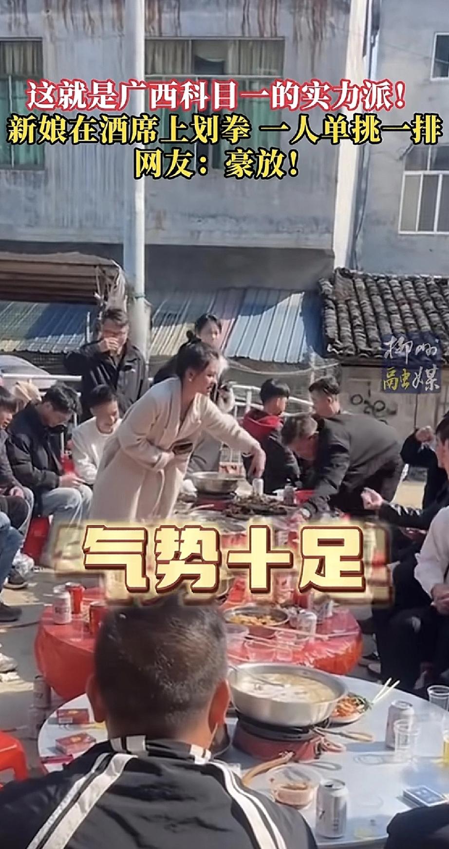 婚礼酒席上,别的新娘文静端庄,这位广西新娘却画风突变——她直接起身,挽起袖子,开始和在座的宾客划拳! 只见她气势十足,一人单挑一整排,出手利落,喊声清脆。宾客们显然也不是对手,纷纷败下阵来。 这场面把网友都看乐了,直呼“豪放!”、“这就是广西科目一的实力派!” 谁说新娘一定要温柔含蓄?这样的喜宴,热闹、接地气,充满了人间烟火味。新娘用最本土的方式,把婚礼变成了宾主尽欢的大派对,这喜庆劲儿,绝对满分!