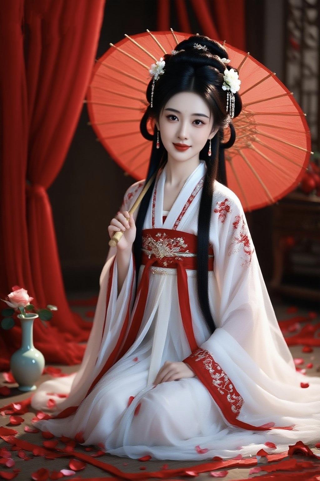 《红伞裁春》 红伞半撑,裁落满庭胭脂色 素裙曳地,拖来一瓣牡丹的波折 鬓边白花,偷沾了檐下的月色 腕底红绦,绾住东风的软 帘影垂红,恰如心事千重 花瓣铺作阶前雪,不沾尘 伞骨撑得春痕碎 每一根竹篾,都漏着江南的晨昏 袖底流云,拂过青瓷瓶上的香 裙间绣纹,缠着金线织的霜 她垂眸时,山河便温软成水 抬眼处,人间已是四月芳菲 罗裙漫过落红,是温柔的沉溺 伞面兜住东风,藏起未说的言语 红与白的纠缠里 岁月也甘愿,在此刻停栖 粉裳伞韵 墨伞佳人图 江南女子花折伞 花锣伞扇旗袍裙 红伞拍照 古风伞写真