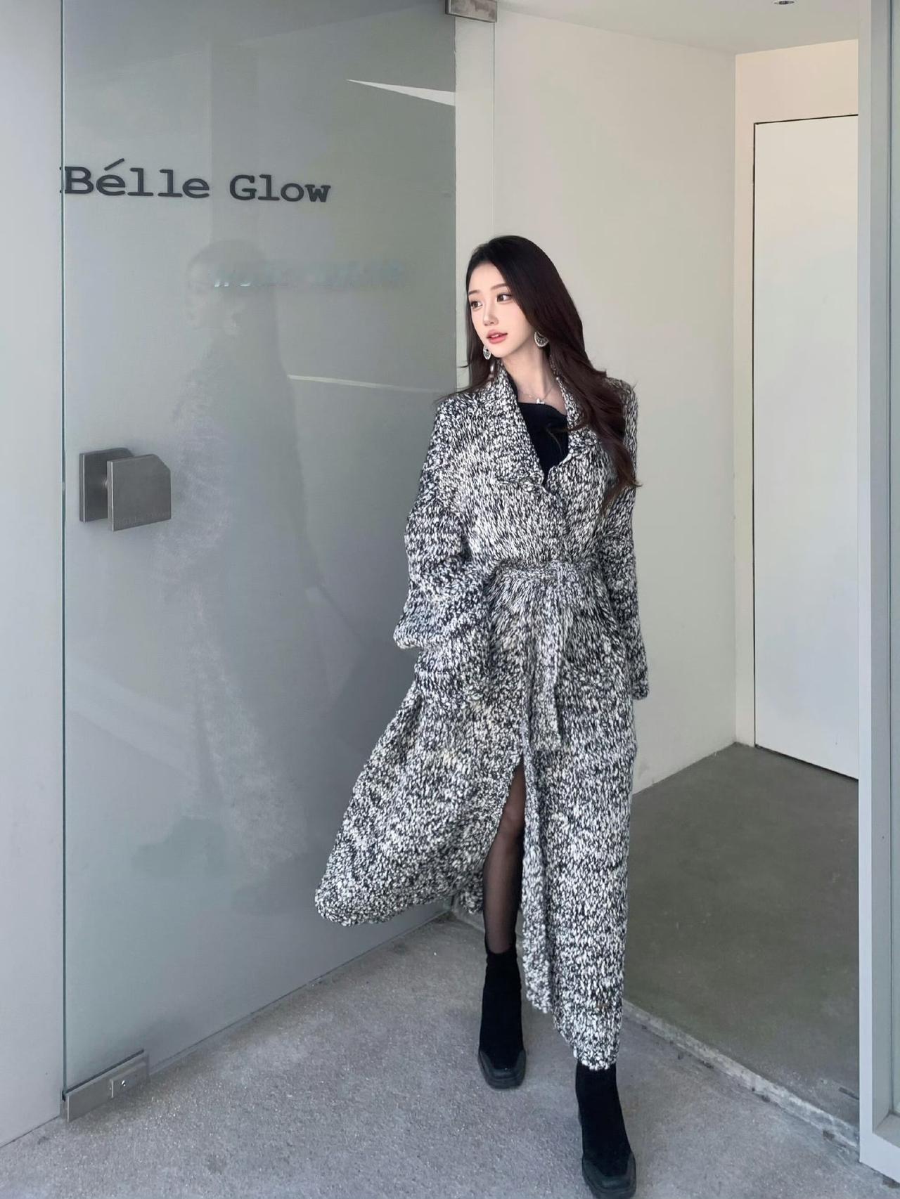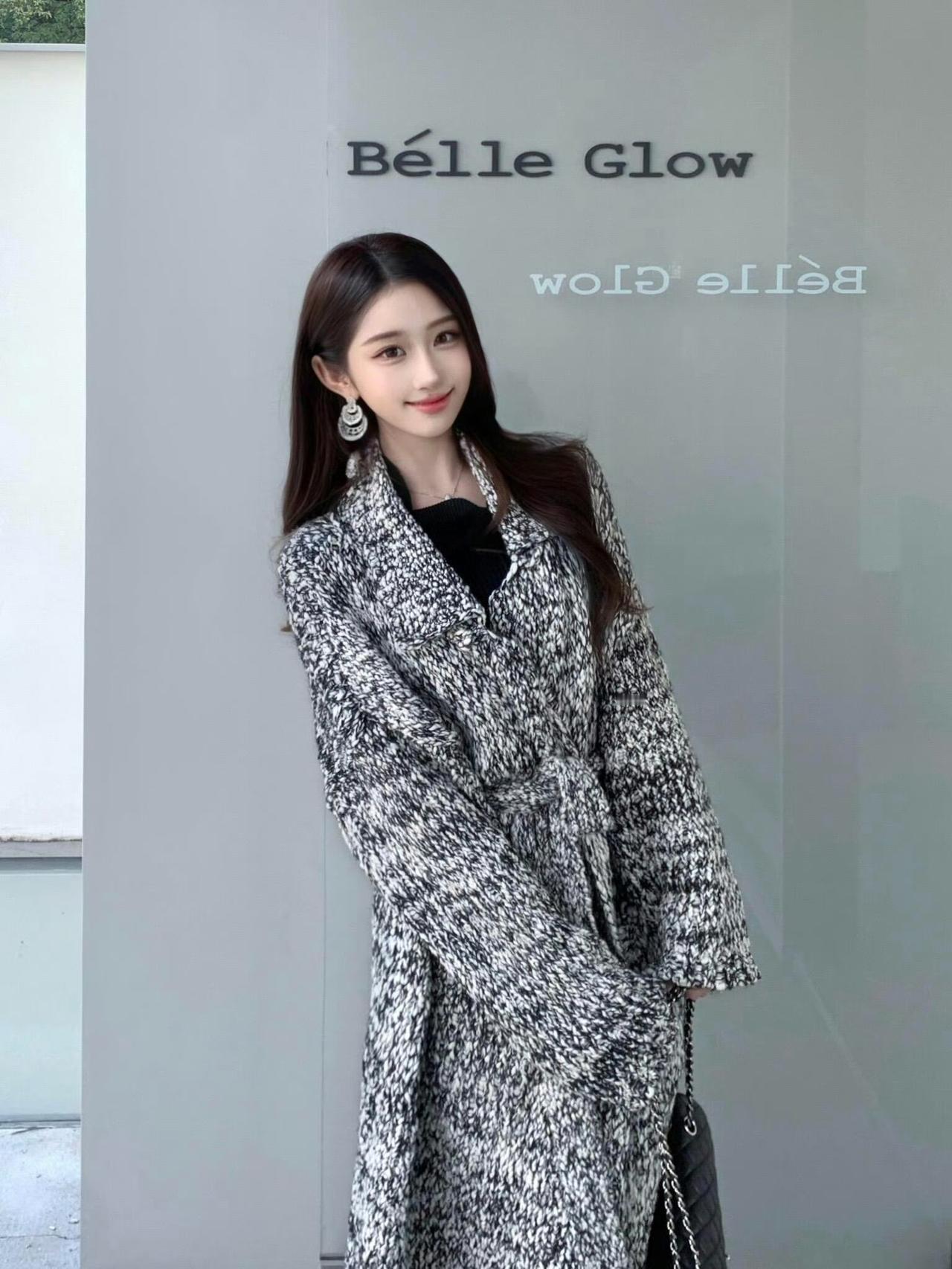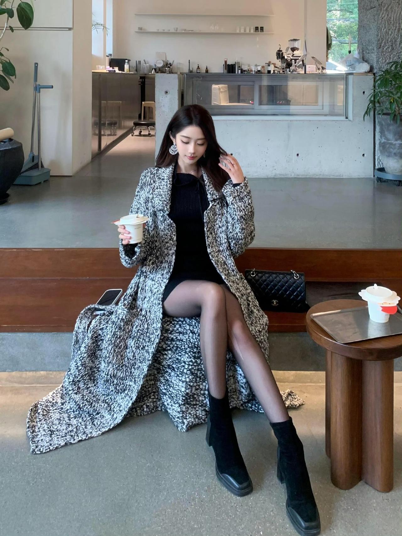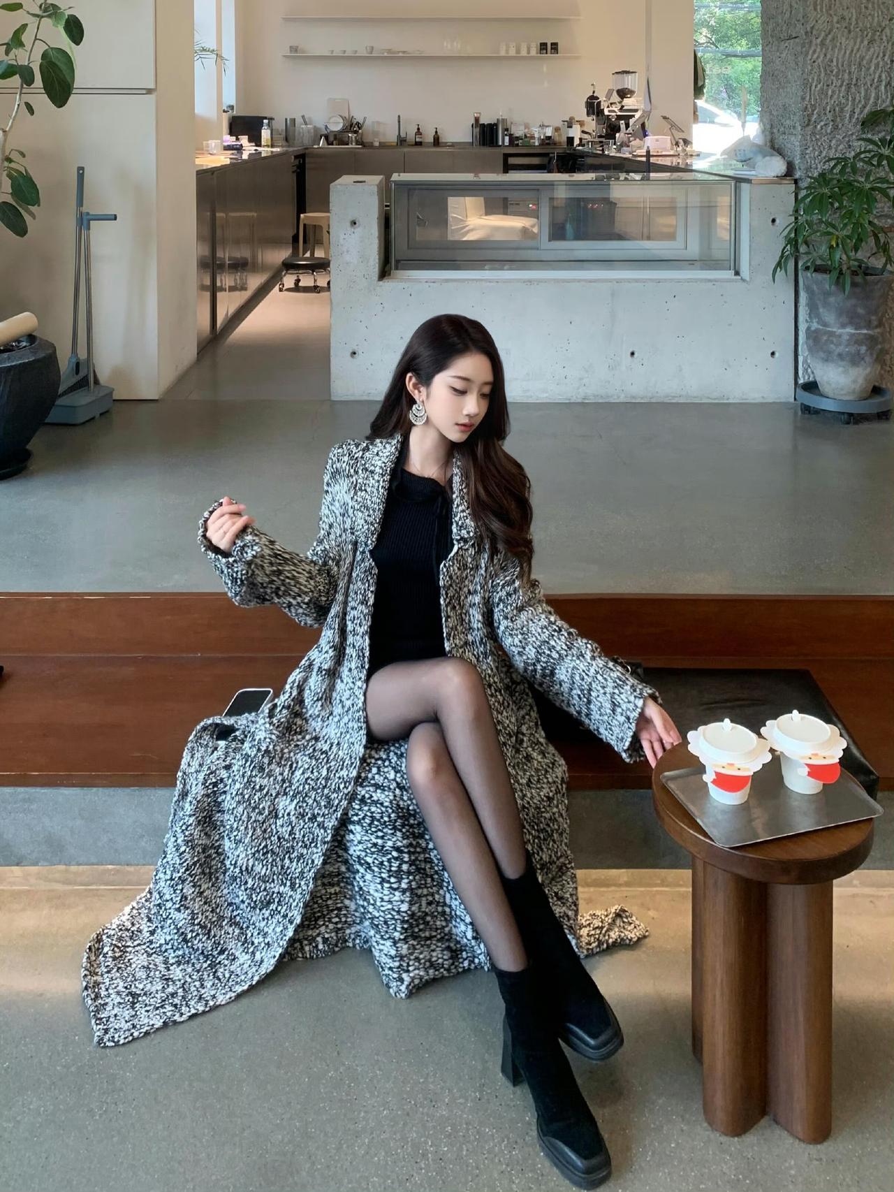 这套穿搭是酷飒高级的黑白混纺轻熟风,把慵懒质感和轻熟感细节融合到位。黑白混纺长款大衣自带松弛高级感,宽松版型营造随性氛围;内搭黑色紧身短裙,抽绳设计注入轻熟感。 搭配厚底短靴强化酷飒气场,修饰腿部线条;菱格黑包提升轻奢质感,让暗调造型更显精致。充分展现穿着者酷飒高级的轻熟魅力。轻奢感大衣穿搭 黑白色调穿搭 有哪些女生日常好看穿搭可以借鉴