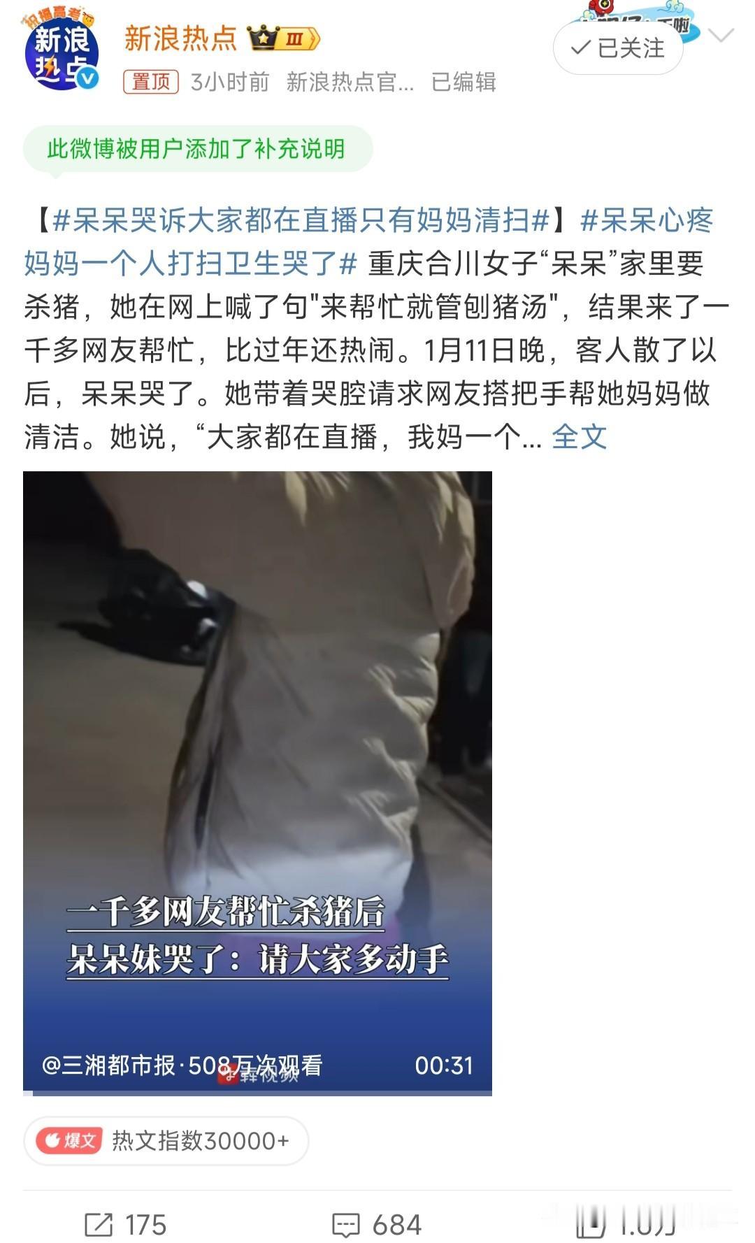 呆呆哭诉大家都在直播只有妈妈清扫 第一,你自己也没有帮助妈妈打扫卫生。 第二,既然你直播有收入,完全可以花点钱雇几个人来打扫卫生。 第三,这件事本来是当地文旅的好机会,希望不要变了味,虎头蛇尾。