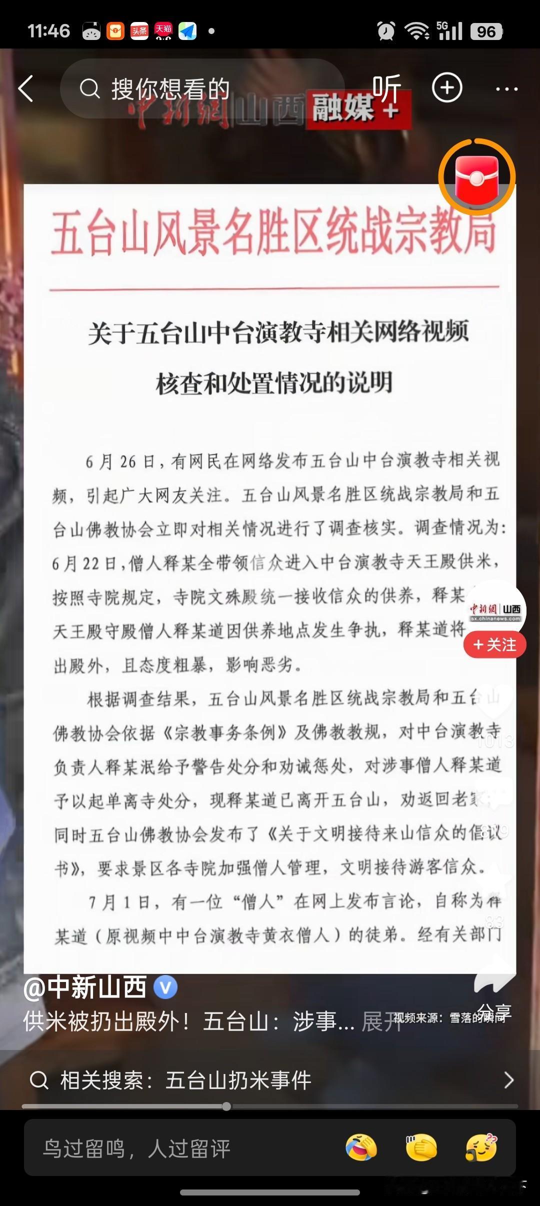 五台山和尚扔米事件后续来了,令人气愤!令人作呕! 一直以来,包括环球时报,网易新闻,澎湃新闻,新京报等官方媒体报道,包括海量的自媒体发帖,都是说的和尚扔米。涉事单位及管理单位自己也发红头文件承认是扔米,怎么现在眼睛一眨老母鸡变鸭?以扔米事件为扔面为由,强逼网友删帖!宪法赋予公民言论自由权!你们有什么资格禁言? 扔米事件,就算是扔面,或者扔其他粮食,本质上都是一样的!扔掉的是善男信女们的一片诚心!扔掉的是自己的信誉!自己人设崩塌,咎由自取!不说闭门思过,反倒是数猪八戒的一一倒打一耙! 屎盆子想要乱扣,捡着软柿子往死里捏以泄私愤!有这想法,就证明还是没改!问题是,事是你们监管不力引起的,根子在于管理单位渎职,跟媒体有什么相干?拉不出屎来怪厕所!就算是杠媒体,也该从央媒开始,挨个来啊,还算敬你是条汉子!拿本大仙当软柿子,硬欺负是吧?那就让全国人民评评理[发怒] 此地无银三百两,越描越黑!自己拉的自己再吃回去,还要不要脸了?自己看图!是米还是面?幸亏网络是有记忆的,否则窦娥棺材板又压不住了[发怒] 还有,贵平台也太不仗义了,对方责问,你们不分青红皂白就删帖?公平正义在哪里?职业道德在哪里?要删帖可以,那就都删啊,为什么捡着删,觉得本大仙好欺负是吧?对自己的客户不保护,不尊重,这是典型的店大欺客!#扔大米事件# #五台山扔米# #扔大米和尚#