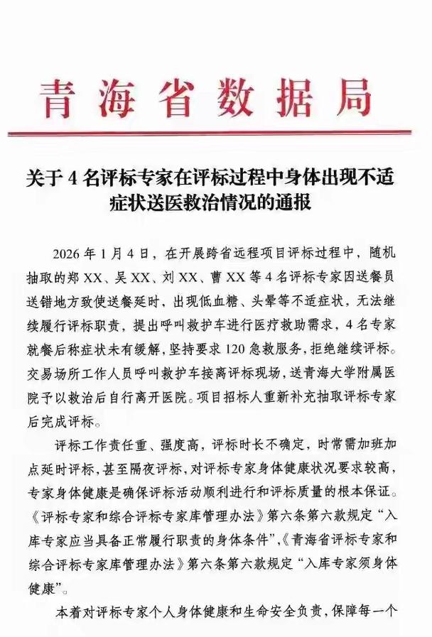 送饭晚了,专家“低血糖”送医,饭碗也跟着“没了”? 青海省一个招标项目的评标现场,近日上演了一幕让人意想不到的插曲。 四位评标专家,因为送餐晚了,竟然集体出现低血糖、头晕等身体不适,最终被紧急送医救治。这事儿还没完——最新通报显示,这四位专家直接被“请”出了省级专家库,从此与评标工作无缘。 很多网友看到消息,第一反应是:“送饭晚了,至于低血糖到要送医吗?专家也这么‘娇气’?” 但通报的措辞很明确:正是因为这四位专家无法继续履行职责,为了保证项目顺利进行、避免意外发生,才做出了这样的处理。 有人觉得处罚太重:“不就一顿饭没及时吃吗?至于丢了‘饭碗’?” 但更多声音认为,评标工作涉及重大公共利益,专家理应具备最基本的职业素养和应急能力。因为一顿饭延误就导致工作停摆,确实说不过去。 这事儿也给所有行业提了个醒:关键时刻“掉链子”,不管原因听起来多“合理”,都可能造成严重后果。评标如此,其他工作也一样——专业精神,有时就体现在“扛得住饿、顶得住困”的细节里。 不过,也有网友提出疑问:评标现场难道没有应急预案吗?后勤保障是否到位?这些或许也值得相关部门反思。 总之,一顿迟来的饭,让四位专家丢了资格,也让我们看到了“责任”二字的重量。 低血糖险情