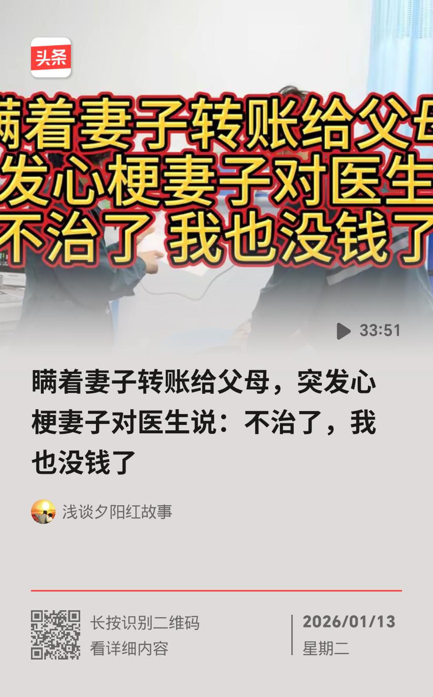 丈夫私转158万给公婆,心梗需18万手术费遭拒,妻子反击太刚 丈夫瞒着妻子把158万夫妻共同财产转给公婆,转头突发心梗急需18万手术费,手握巨款的公婆却冷漠拒付,妻子在ICU门前的绝地反击,狠狠撕开了畸形亲情的遮羞布。 李明轩偷偷将家里158万积蓄转入父亲账户,声称是给父母养老,还特意叮嘱不能让游手好闲的弟弟沾边。可这笔钱没成养老保障,反倒成了公婆的“底气”。某天,李明轩在办公室突发急性心梗被送医,医生告知需立刻手术,先交18万费用。 妻子苏婉清翻遍所有账户,只剩不到五千元,只能求助公婆。谁料公公直接说没钱,婆婆挂断电话,小叔子还在一旁嘲讽。苏婉清没有哭闹,冷静告诉医生“不治了,我没钱”。这不是绝情,是被逼到绝境的止损——就算凑够手术费,后续康复费也会拖垮她和儿子的未来。 随后苏婉清拿出转账记录、公婆推诿的录音和小叔子炫富的照片,全发到家族群。她要追回这笔夫妻共同财产,这是儿子的学费,也是她的生存底线。 法律明确规定,夫妻共同财产一方无权擅自处置,苏婉清的反击不仅是为自己维权,更提醒所有人:亲情不能凌驾于法律和情理之上,遇到财产侵占,要果断拿起法律武器保护自己。岳父心梗 心梗赔偿