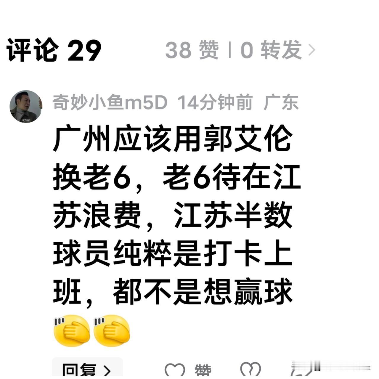 评论区:广州用郭艾伦换江苏庞老六? 刚看到一位广东球迷评论区留言:广州用郭艾伦换江苏队庞老六,老六在江苏打球有点浪费了,江苏队的球员都是只打卡上班,都不想赢球。 说实话!即使广州队愿意用郭艾伦去换庞峥麟,江苏队99%不同意交换,郭艾伦最近四个赛季出勤率不足3成,工资还是顶薪合同,而庞峥麟年薪不足郭艾伦的十分之一,况且庞峥麟还有很大的提升空间,江苏队再赢不了球也不可能接受一个即将退役的郭艾伦,就算江苏队这个赛季继续摆烂锻炼庞峥麟未来卖个高价值总比支付郭艾伦的高额工资要划算得多。 况且庞峥麟加盟江苏队后,球队收获不少的人气和曝光率,郭艾伦的人气已开始退潮了,看看广州队的主场上座率直线下滑就知道了!