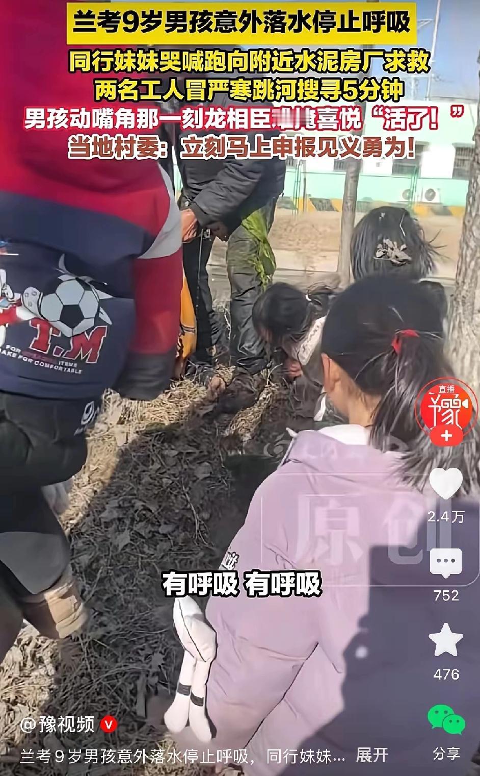 兰考9岁男孩意外落水停止了呼吸。同行的妹妹哭喊着跑向附近水泥房厂求救。两个工人听到后,冒着严寒跳进河里搜寻了5分钟。功夫不负有心人,他们终于发现男孩,并把男孩救上了岸,立即做心脏按压。男孩的嘴角动了。活了,他们难掩喜悦的心情。村委立马申报见义勇为,不让好心人白做。 当时河面结着薄冰,寒风刮得人脸生疼,两个工人连棉袄都没来得及脱,“扑通”就扎进刺骨的河水里。他们憋着气在水里摸索,手冻得发麻也不敢停,心里只有一个念头:赶紧找到孩子!捞上岸时男孩脸色青紫,他们跪在地上轮流按压胸口,一下又一下,直到看到男孩嘴角动了,才瘫坐在地,捂着胸口大口喘气。 这哪是普通的援手,分明是拿命换命的情义!更暖心的是村委的做法,第一时间申报见义勇为,不让好人寒了心。善良从来都不是孤军奋战,总有人为正义撑腰。你身边有没有这样挺身而出的普通人?