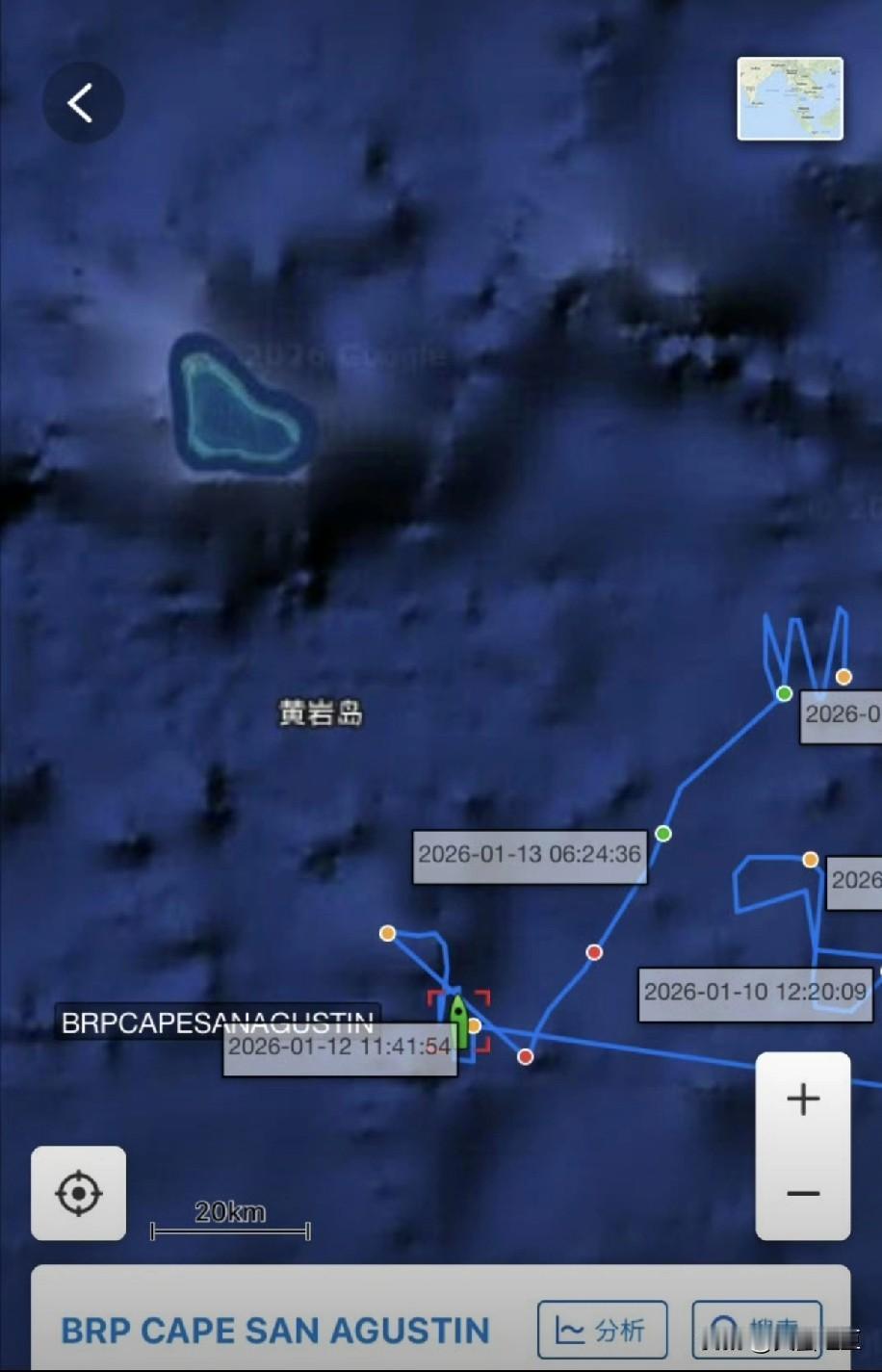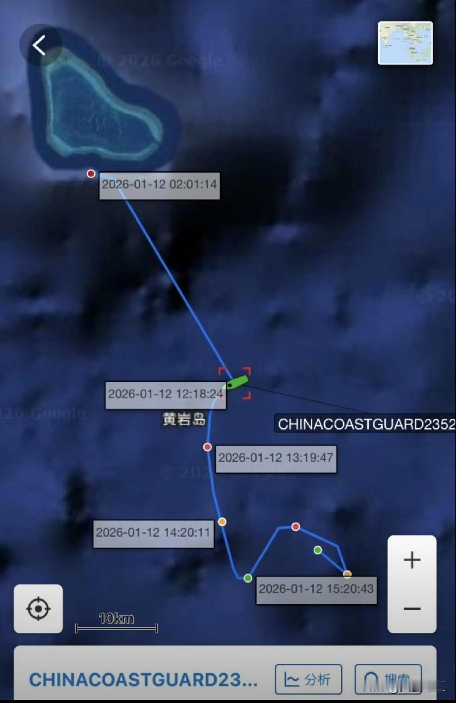 菲律宾再次在黄岩岛附近海域挑衅——1月12号,菲律宾海岸警卫队派出所谓的渔民前往黄岩岛附近海域挑衅,在黄岩岛东南海域遭中国海警23521艇和中国海军攀枝花舰拦截。 菲律宾海岸警卫队发布的消息称,1月12号中午,23521艇靠近所谓的菲律宾渔船30米以内的鸣响警报,阻断其航线,事发地点距离黄岩岛约16海里。23521艇航迹如图4。 12号下午3点多,菲律宾海岸警卫队4408船与所谓的渔船汇合,接应所谓的渔民。4408船的活动轨迹如图。菲律宾