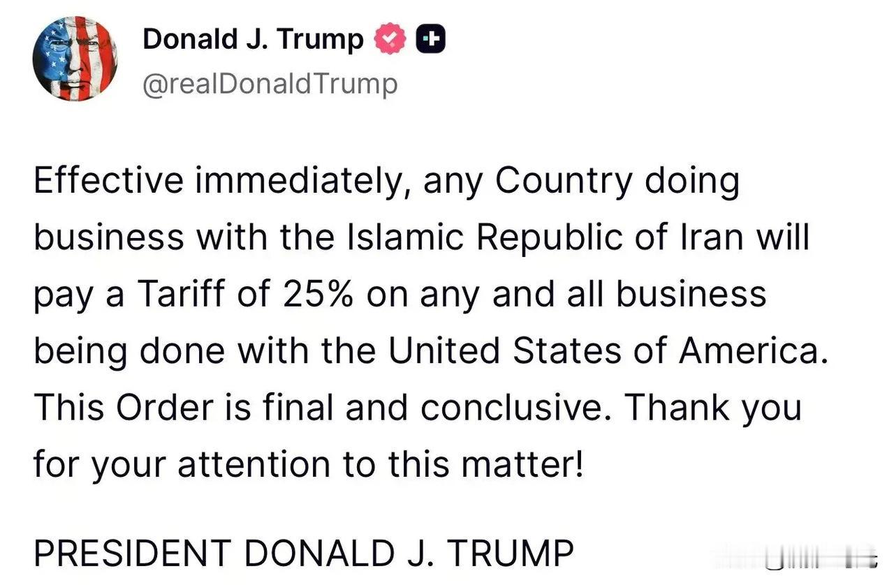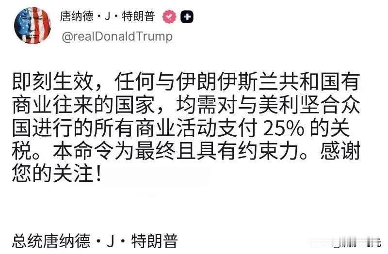 压垮伊朗的最后一根稻草!特朗普宣布对任何与伊朗进行商业往来的国家征收 25% 的关税,立即生效!美国特朗普关税 特朗普对伊朗实行的二级制裁是压垮伊朗经济的最后一根稻草!伊朗政权现在摇摇欲坠,打击伊朗重要军事目标不是特朗普的唯一选择;斩首——让领导先走的战争模式是现在战场上的重要手段!(个人观点,仅供参考)