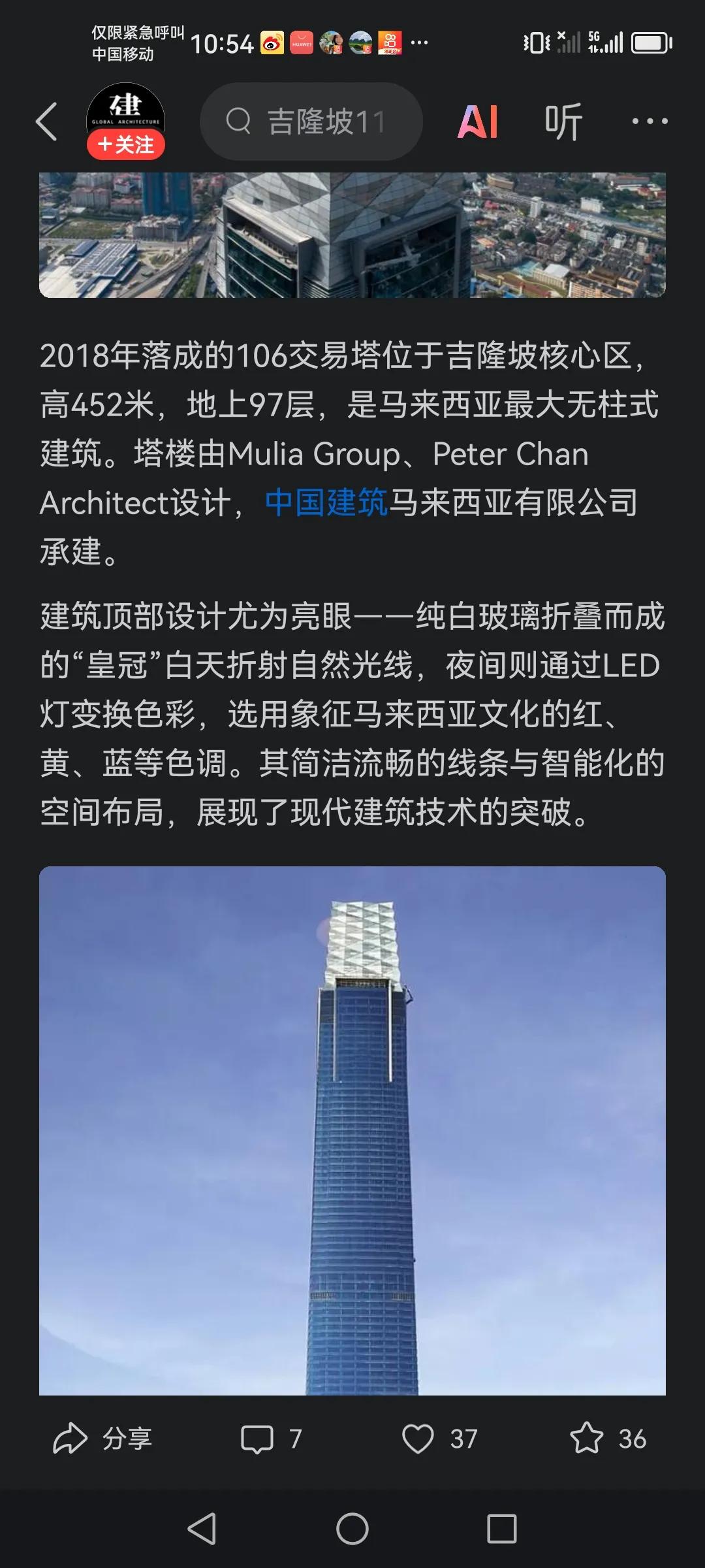 位于马来西亚首都吉隆坡的106交易塔 是马来西亚第二高楼,也是马来西亚最大的无柱式建筑,这个厉害了啊!大楼高452米,地上97层,地下4层,楼顶的塔冠,每到夜晚都会亮起灯冠,非常的漂亮。由中国中建八局用时31个月建成,打破马来西亚的建筑速度,3天一层的速度也是当地的建筑史上的一次突破!以上仅供参考,鬲个人意见。