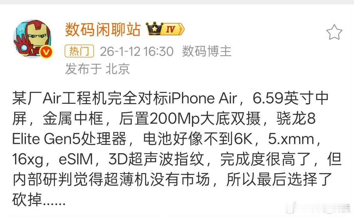 这台被砍的小米 17 Air工程机还真是完全对标iPhone Air,从图片看来比iPhone Air更薄,如果价格控制到位,其实是有市场的😏