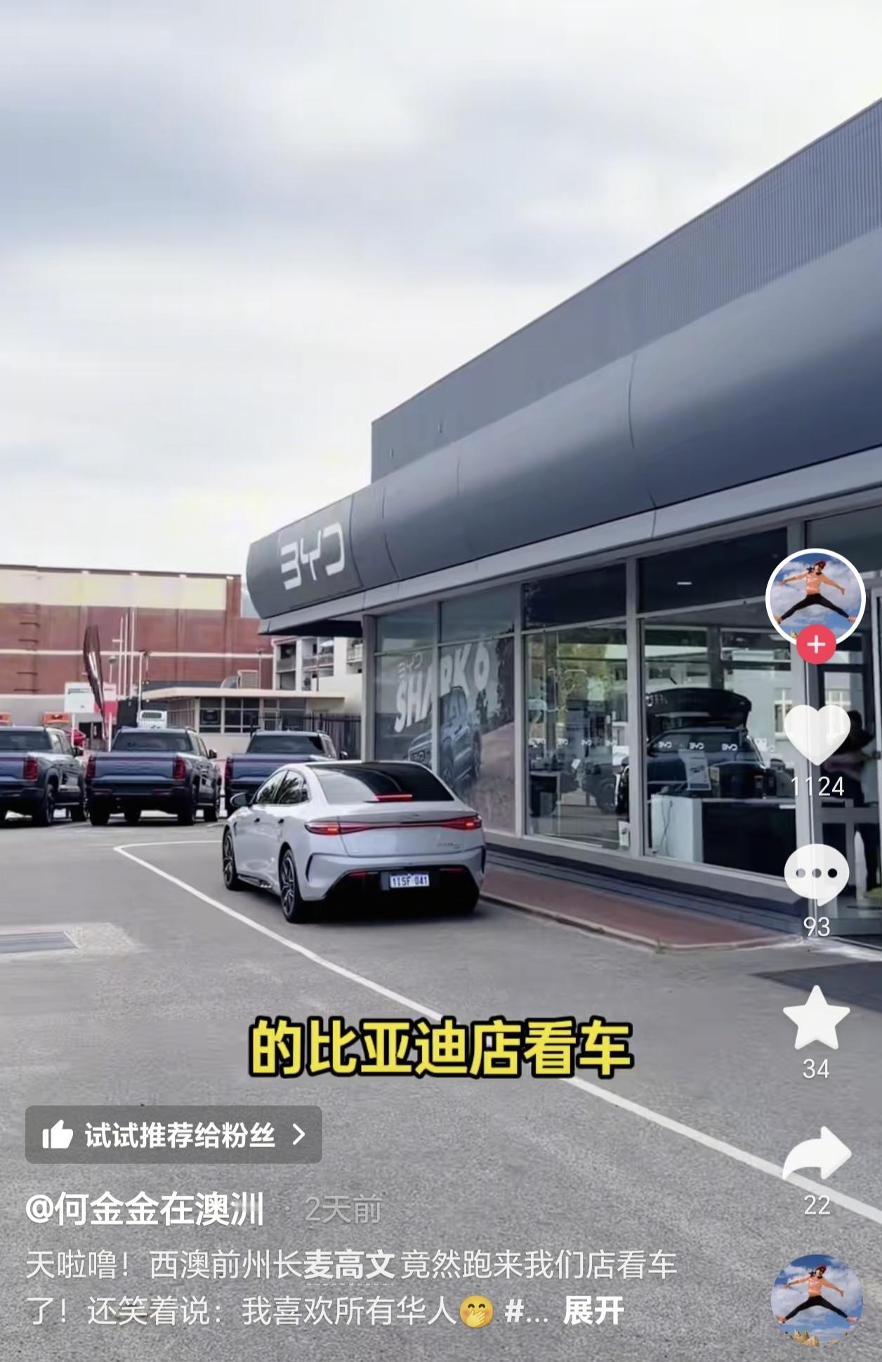 刚刚刷到个视频,西澳前州长麦高文来比亚迪店里看鲨鱼皮卡,这谁看了不觉得老自豪。 讲真,这皮卡虽然国内还没上市,但光看海外那些视频,那性能、那科技感,就让人心里直痒痒,别说海外那么受欢迎,就连国内都呼声不少希望尽快上市。 更值得一提的是,2025年比亚迪出海销量直接干到了100多万辆,同比暴涨145%,这一亮眼成绩不仅彰显了比亚迪在国际市场的强大竞争力,更反映出了中国汽车品牌在全球范围内的认可度和影响力正在快速提升。