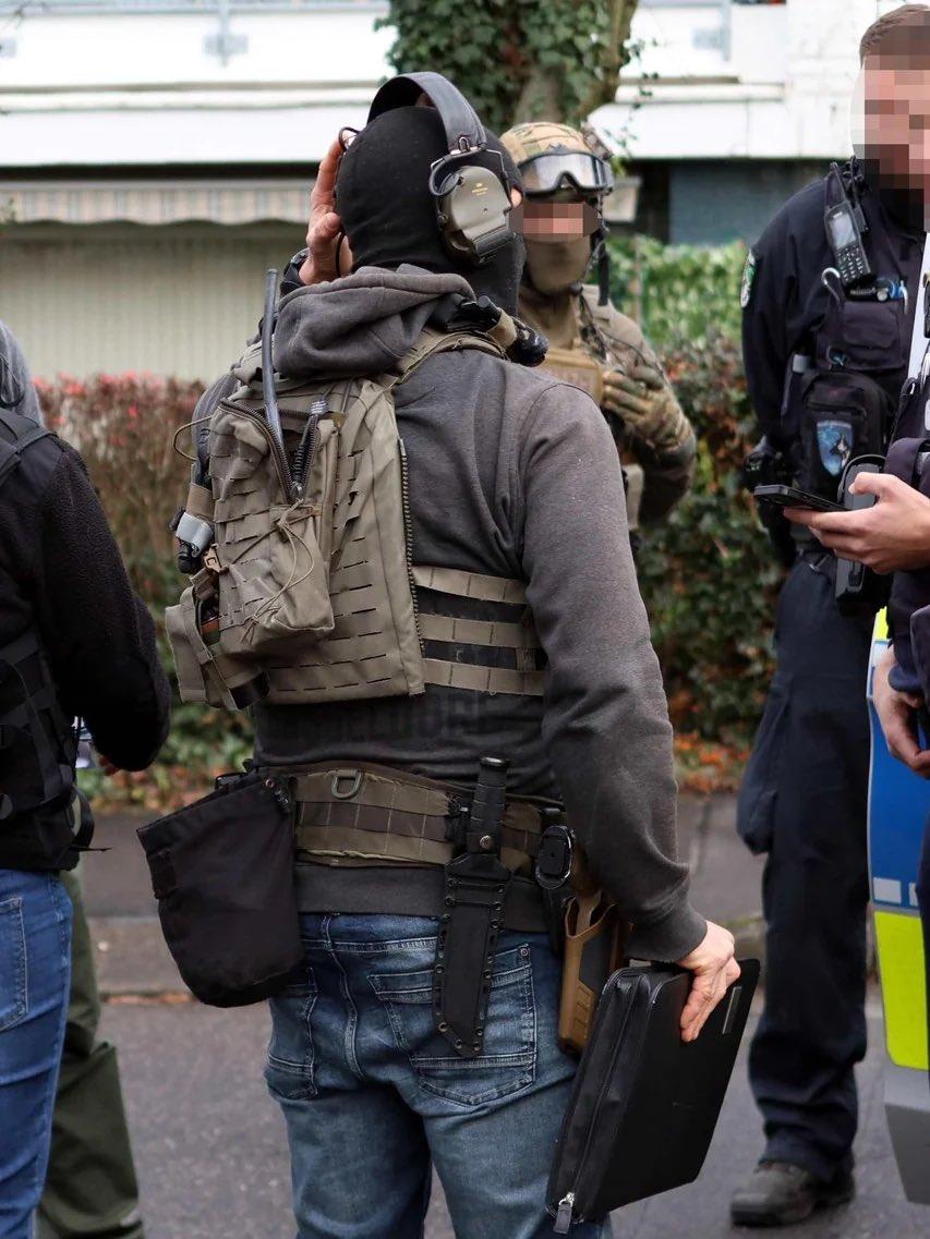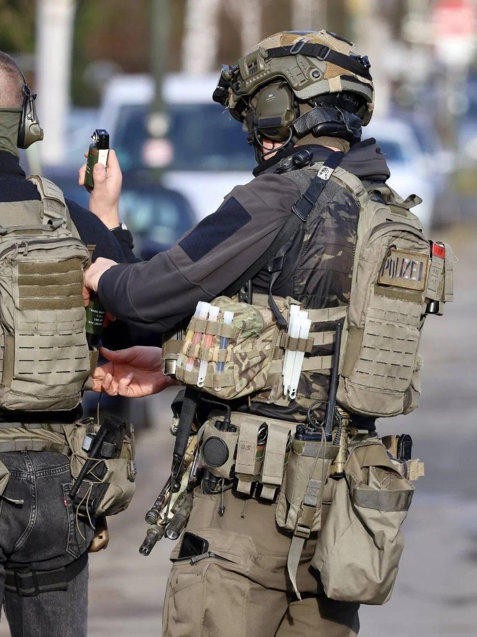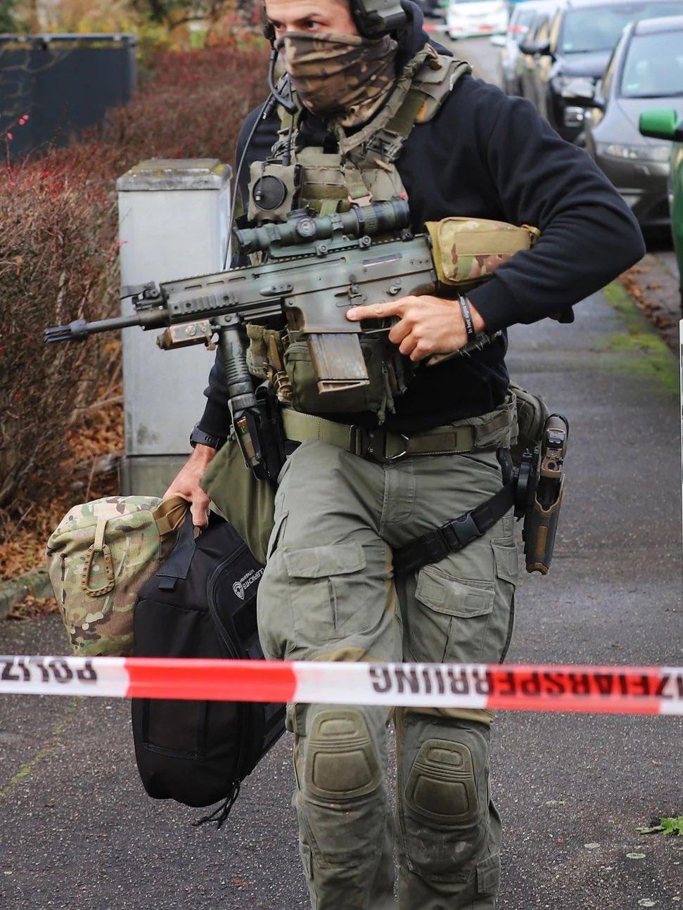 2025年12月底德国勒沃库森的一次德国特种部队(SEK)行动。当时,特警接到报告称一处公寓内有一名持枪人员,随后展开了长达五个小时的对峙,最终逮捕了两名男子并缴获了一件武器。 图片展示了战术细节,例如一名特警队员使用的FN SCAR-H CQC战斗步枪,该步枪配备了Leupold Mark 6 1-6倍瞄准镜,体现了SEK在城市行动中使用模块化高端装备的特点。