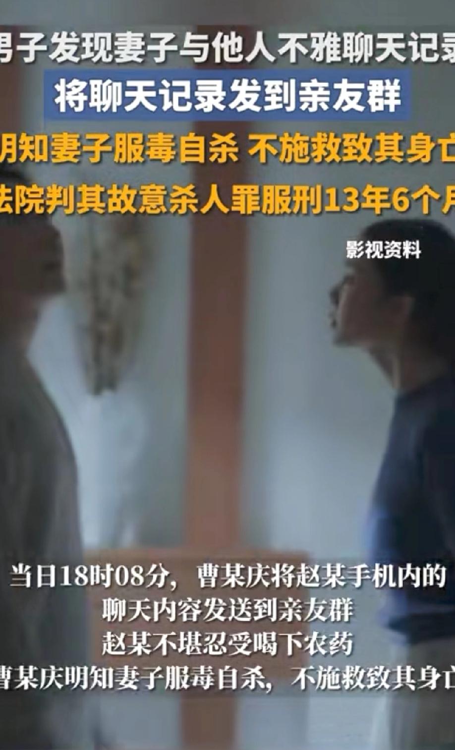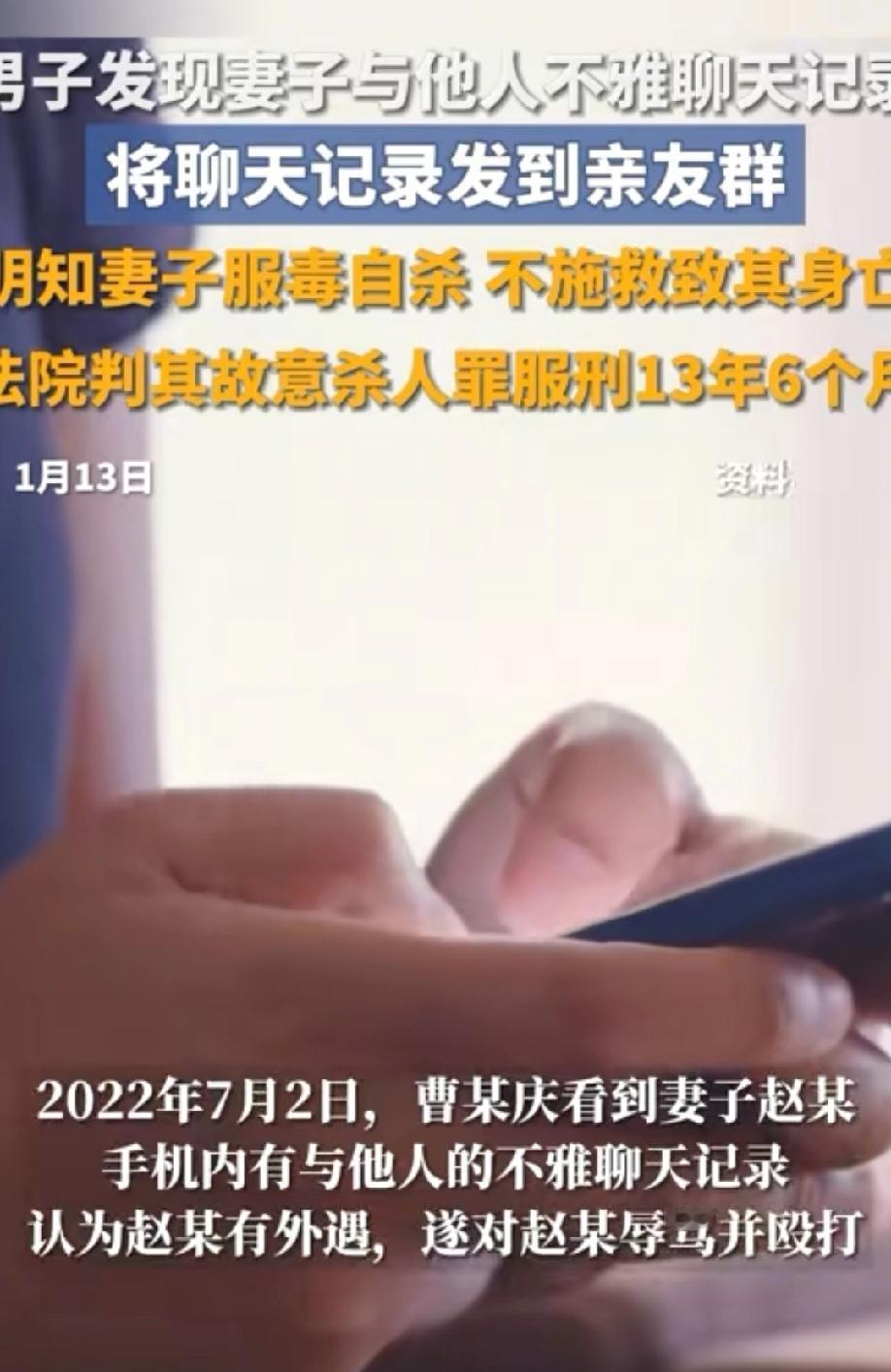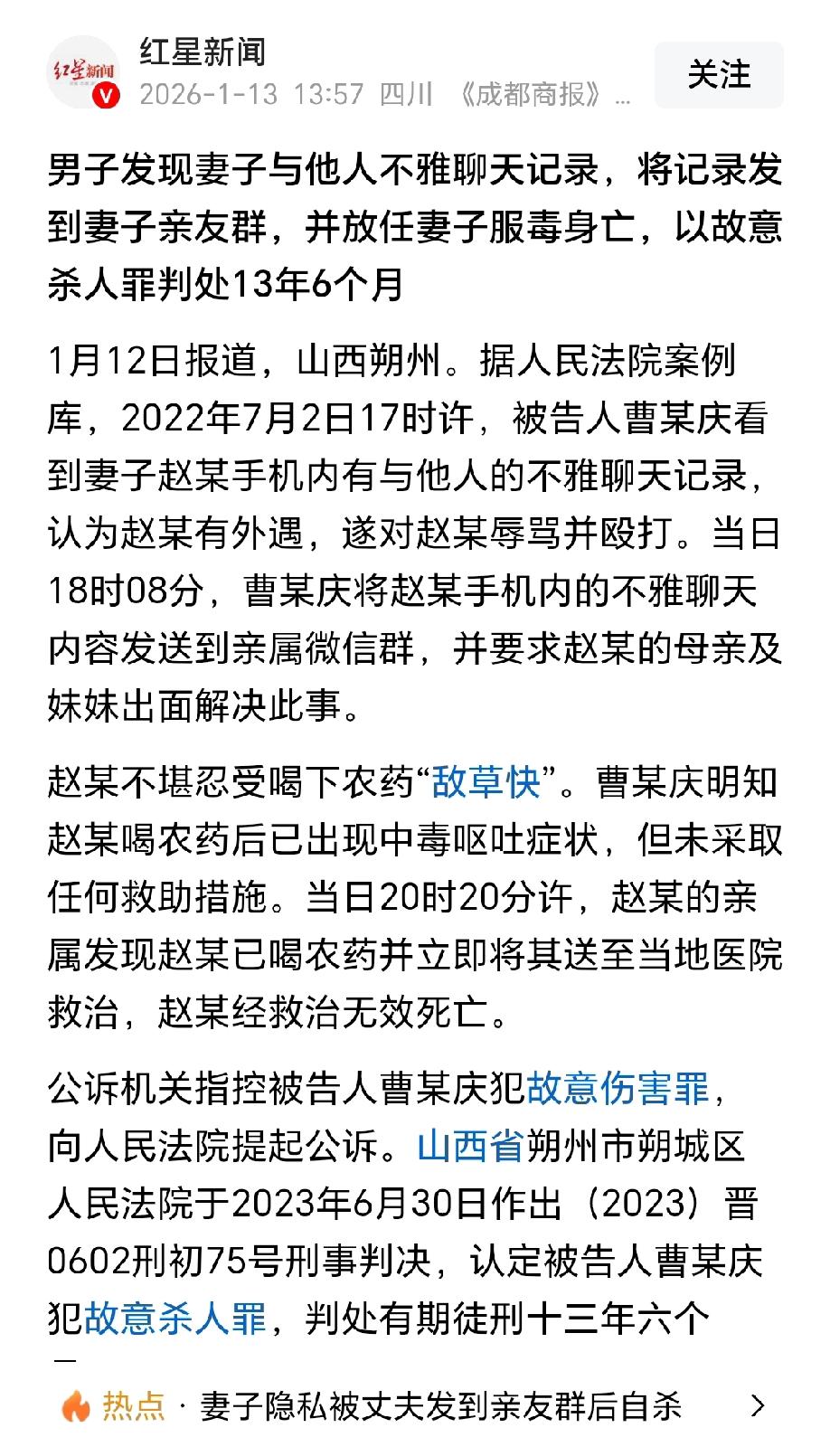 山西朔州,男子查看妻子手机发现一些不雅聊天记录,便因此认定妻子出轨,对妻子辱骂殴打觉得不解气,又把这些聊天内容发到亲属群里,让妻子身败名裂。妻子自知没脸见人,选择了喝农药自杀,男子得知后,依然无动于衷。事后,妻子经抢救无效死亡,男子被司法机关认定涉嫌故意杀人罪。男子不服:农药是她自己喝的,关我什么事? 据观威海报道,2022年7月2日下午,男子曹某百无聊赖地翻看着妻子赵女士的手机,本是无意之举,却翻出了让他无意见看到了妻子和别人的不雅聊天记录。 看着那些露骨的文字,曹某的脑子“嗡”的一声炸开了,一股无名火瞬间窜遍全身,他觉得妻子肯定做了对不起他的事,他的头顶仿佛都绿了。 曹某没等赵女士的解释,对着妻子就是一顿劈头盖脸的辱骂,骂到激动处,还忍不住对赵女士动了手。 拳头落在身上的疼痛,夹杂着刺耳的辱骂,让赵女士低着头,一句话也说不出来。 可曹某依旧觉得不解气,他心里憋着一股邪火,非要让妻子付出更惨痛的代价。 他盯着手机里的聊天记录,一个恶毒的念头涌上心头:要让她在亲戚面前抬不起头,让她身败名裂。 当天傍晚6点08分,曹某不顾赵女士的苦苦哀求,直接将那些不雅聊天内容截图,一股脑发到了亲属微信群里,还在群里喊话,让赵女士的母亲和妹妹赶紧出面“解决这事”。 这消息一出,群里瞬间炸开了锅,各种议论声、质疑声扑面而来。赵女士看着群里的消息,只觉得浑身冰冷,血液都像是凝固了。 赵女士平日里性格内敛,格外看重脸面,如今私密的聊天被公之于众,还要被亲戚指指点点,她只觉得没脸见人,活着都像是一种煎熬。 绝望之下,赵女士找到了家里的农药“敌草快”,含泪喝了下去。 没过多久,农药的毒性发作,赵女士开始剧烈呕吐,整个人蜷缩在地上,痛苦不堪。 曹某就在旁边看着,他明明知道妻子喝了农药,也看到了妻子痛苦的模样,可他心里的怨气还没消,竟硬生生地没有采取任何救助措施。 曹某既没打急救电话,也没联系亲戚帮忙,就这么眼睁睁地看着妻子在地上挣扎,好像只有妻子的痛苦才能化解他心中的仇恨。 直到当天晚上8点20分,赵女士的亲属发现了不对劲,这才匆匆赶来将她送往医院抢救。 可一切都太晚了,农药的毒性已经深入脏腑,赵女士最终还是因抢救无效死亡。 妻子没了,曹某却丝毫没有悔意。在他看来,妻子这完全是咎由自取,出轨在前,事情败露后,农药也是妻子自己喝的,和他没有半点关系。 殊不知,曹某的这一切早已涉嫌犯罪,公安机关得知案情后,第一时间对曹某采取了刑事强制措施。 经过公安机关的侦查,检查机关审查后,最初以故意伤害罪对曹某提起公诉,对此,法院会如何审理呢? 法院审理后认为,曹某的辱骂、殴打行为,以及将私密聊天发至亲属群的羞辱行为,是导致赵女士自杀的直接诱因。 更关键的是,曹某明知妻子喝农药中毒,却放任死亡结果发生,主观上具有间接故意,其行为更符合故意杀人罪。 《刑法》第二百三十二条规定:故意杀人的,处死刑、无期徒刑或者十年以上有期徒刑;情节较轻的,处三年以上十年以下有期徒刑。 法院认定,曹某的行为构成不作为的间接故意杀人罪。 主观上,曹某对妻子死亡持间接故意(明知可能发生且放任),而非过失。 客观上,曹某在妻子服毒后,基于夫妻间的救助义务,曹某明知不救助会导致死亡结果,却放任结果发生,属于以不作为方式实施的杀人行为。 《刑法》第十三条规定:一切侵犯公民的人身权利、民主权利和其他权利,以及其他危害社会的行为,依照法律应当受刑罚处罚的,都是犯罪,但是情节显著轻微危害不大的,不认为是犯罪。 曹某的一系列行为严重侵犯妻子的生命权与人身权利,对家庭与社会秩序造成恶劣影响,且不属于“情节显著轻微危害不大”的情形。 曹某主张“农药是她自己喝的,关我什么事”,是对法律上“因果关系”与“不作为义务”的误解。 他的先行行为引发救助义务,不履行义务并放任死亡结果,与妻子死亡存在法律上的因果关系,依法应受刑罚处罚。 最终,朔州市朔城区人民法院判处曹某有期徒刑十三年六个月。曹某不服判决提出上诉,朔州市中级人民法院审理后,驳回上诉,维持原判。 直到这一刻,曹某或许才真正明白,他的偏执和冷漠,不仅毁了妻子的一生,也亲手葬送了自己的后半生。