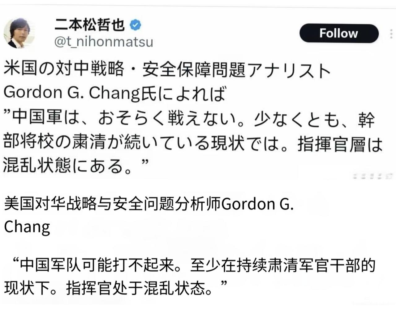 1月13日,日本右翼分子二本松哲也称,日本无需高估中国的实力,中国的军队可能并不
