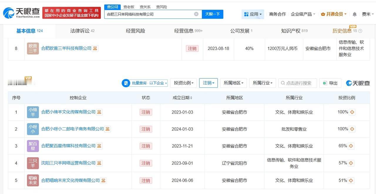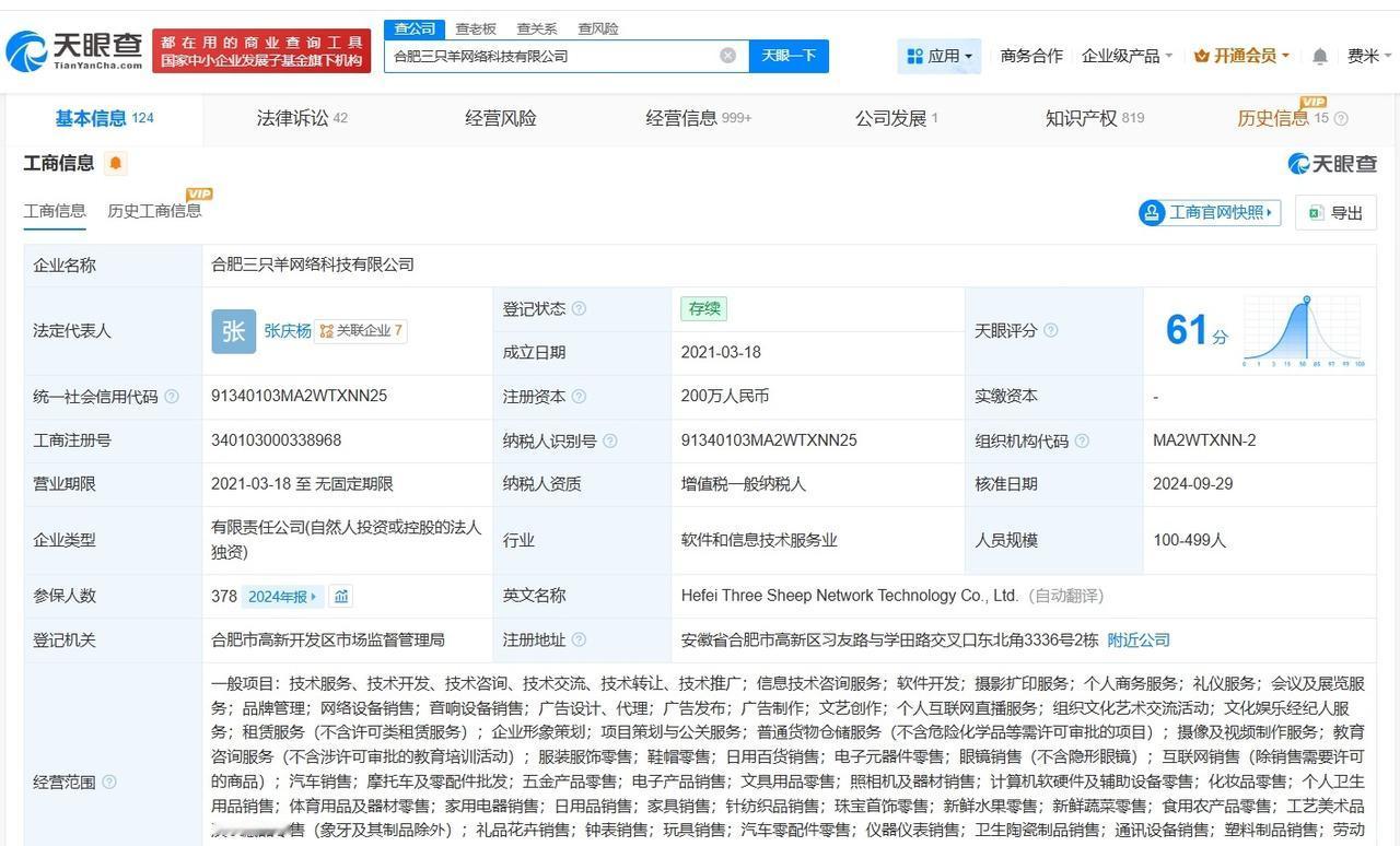 三只羊复播后掉粉1.8万 三只羊去年已注销多家公司 三只羊近30日掉粉9.7万三只羊网络正式复播 据媒体报道,1月12日晚,三只羊网络抖音官方账号正式复播,这也是其自2024年9月停播后的首场复播。这场直播持续4小时,累计销售额近25万元,观看人次达42万,在线人数峰值达3900人。 第三方数据显示,截至1月13日下午2点,三只羊网络视频平台粉丝数为951.3万,复播后掉粉1.82万,过去30日掉粉9.76万。此外,其1-20s视频广告报价为20万元,21-60s视频广告报价为28.61万元,60s以上视频广告报价为36.06万元。 天眼查工商信息显示,该账号关联公司合肥三只羊网络科技有限公司成立于2021年3月,法定代表人为张庆杨,注册资本200万人民币,经营范围包括信息技术咨询服务、软件开发、摄影扩印服务等。股东信息显示,该公司由三只羊(合肥)控股集团有限公司全资持股。值得一提的是,去年,该公司旗下合肥聚百星传媒科技有限公司、沈阳三只羊网络运营有限公司、合肥唱响未来文化传媒有限公司、合肥欧普三羊科技有限公司均已注销。 天眼查信息: