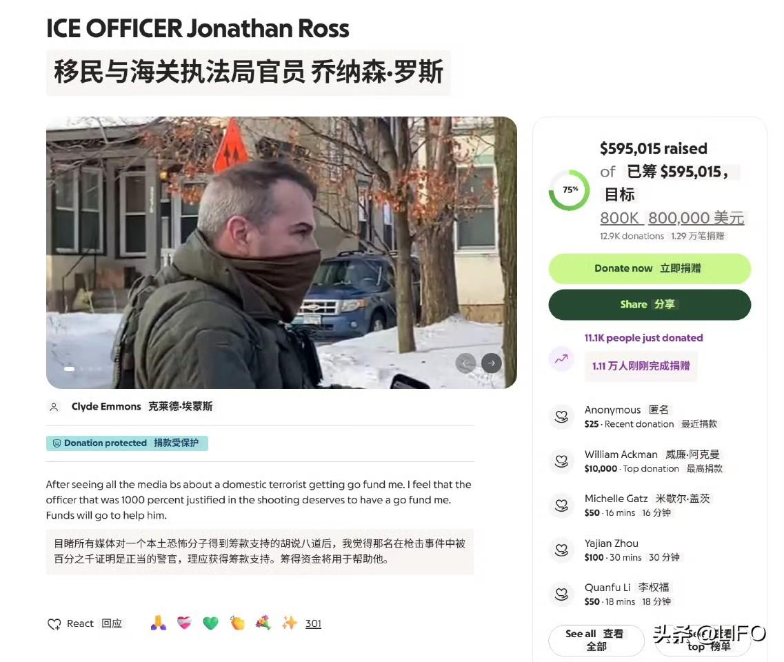 美国 MAGA 阵营给杀人的 ICE 探员众筹了 59 万美元了。搞笑的是,从捐款名单来看,还有很多黄 MAGA 捐了钱。