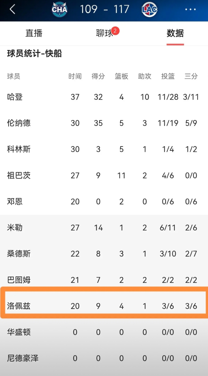 快船老将洛佩兹真是铁树开花!在今天快船主场以117:109击败黄蜂的比赛中,洛佩兹的三分手感终于复苏了,他在替补出战的20分钟里,三分球6中3得到9分,还有4篮板1助攻1抢断,他的场上正负值为+7。