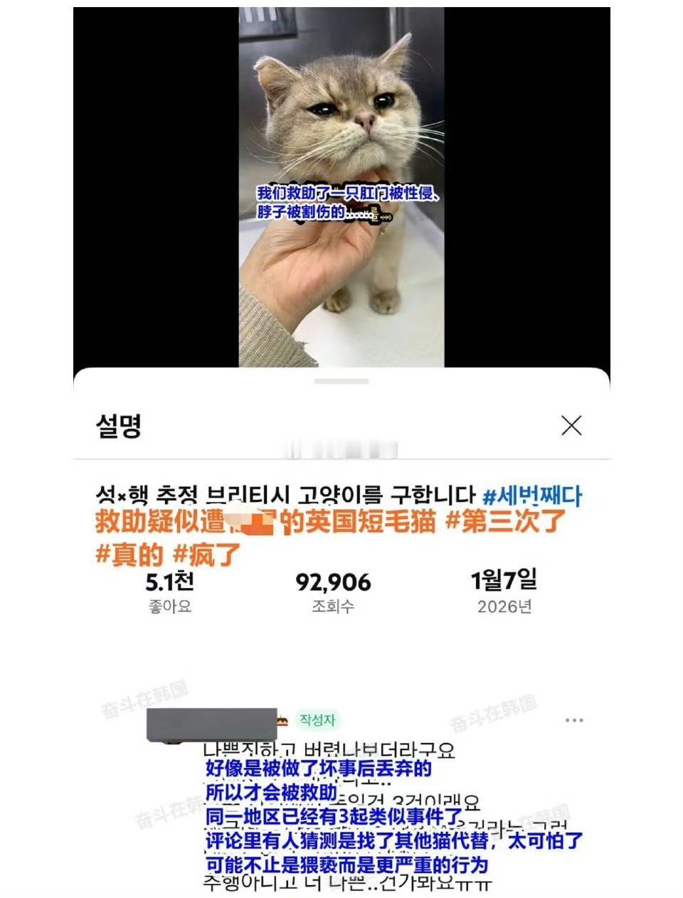 最近韩国发生的一起疑似性侵猫咪事件,像一颗炸弹在社交媒体上炸开了锅。网友们气得直拍桌子,有人喊“这根本不是人”,有人骂“该判死刑”,还有人翻出几年前类似的虐猫案,发现这类恶行竟像幽灵一样反复出现。 事情要从釜山某社区说起,有居民在深夜听到猫的惨叫,循声找去,发现一只橘猫瘫在草丛里,后腿骨折,肛门溃烂,身上还有被硬物击打的痕迹,更让人揪心的是,猫咪的生殖器有明显损伤,像是被塞了异物,送医后,兽医摇头说:“肛门撕裂严重,体内还有没取干净的异物,能撑到现在已经是奇迹。”这起事件像一面镜子,照出了韩国动物保护的困境。2024年3月,京畿道金浦市就发生过类似悲剧:一只叫“明基”的雌性小狗被路人发现时,头部被钉子砸得露出骨头,后腿盆骨被麻绳绑住,生殖器塞着异物,肛门被利器割伤,体内全是脓液,更可怕的是,几乎同时,同区域一只黑猫也被发现眼球被捏爆,后腿敲断,肛门同样被塞了异物。当时网友就怀疑:“是不是同一个变态干的?” 这类恶行之所以让人愤怒,不仅因为手段残忍,更因为它们像多米诺骨牌一样,推倒了社会的道德底线。韩国网友在评论区怒吼:“今天能对猫下毒手,明天是不是就敢对小孩动手?”这不是危言耸听——美国司法部曾统计,虐待动物者中,有30%后来会升级为暴力犯罪。更讽刺的是,韩国现行《动物保护法》规定,虐待动物最高只判3年有期徒刑或3000万韩元罚款(约合人民币16万元),连网友都吐槽:“这点钱,还不够施暴者买辆好车。”不过,希望也在萌芽,中韩两国的动保组织最近联合发声,呼吁推动《反虐待动物法》立法。他们建议借鉴美国经验:美国50个州都有反虐待动物法,最严重的虐杀罪可判10年监禁;德国甚至规定,虐待动物者可能被禁止养宠物,韩国也有进步,2023年修订的《动物保护法》首次规定,反复虐待动物者最高可判1年6个月有期徒刑,但网友不买账:“这哪够?必须像对待性犯罪一样,给施暴者戴电子脚铐!”普通人也行动起来了,有人发起“拒绝观看虐待动物视频”的倡议,因为这类视频在网络传播,会诱导更多人模仿;有人给国会写联名信,要求加重刑罚;还有人自发组织巡逻队,在社区里盯着可疑人员。就像一位韩国阿姨说的:“我养了20年猫,它们不是玩物,是家人,谁敢伤害我的家人,我就跟他拼命!” 这起事件像一记警钟,提醒我们:对动物的残忍,最终会反噬人类自己,当法律能像保护人类一样保护动物,当每个人都能对虐待说“不”,我们的社会,才会真正配得上“文明”二字。韩国疑似发生性侵猫咪事件 事件来源:奋斗在韩国