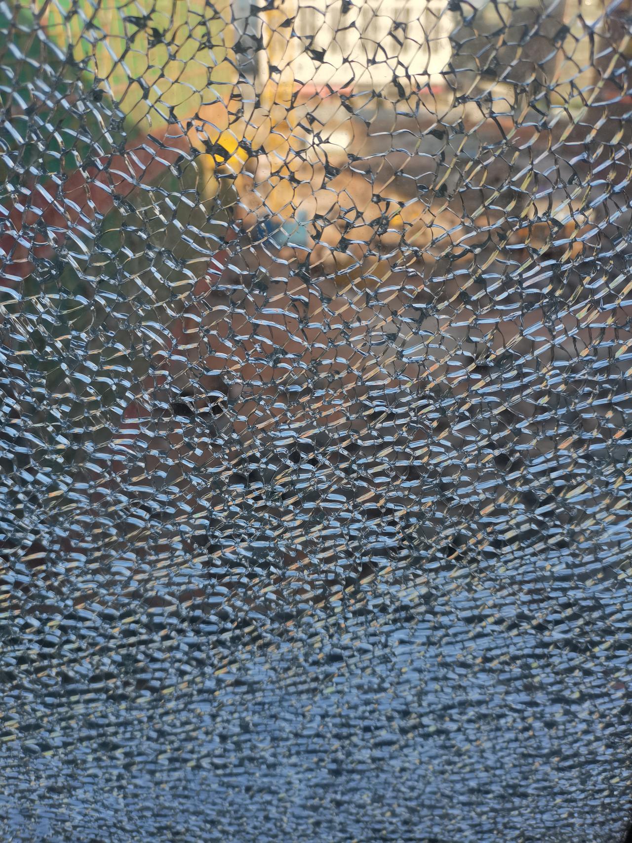 钢化玻璃碎了后是这个样子的。 下午在工厂三楼发现一块钢化玻璃不知道何时碎了,有人在碎玻璃上贴了几条胶纸,很少近距离看到钢化玻璃碎了后的样子。 看起来钢化玻璃碎了也是有方向和特定的秩序的,是从打击点向外延伸辐射的一个特殊图形。 工厂还在紧锣密鼓的装修中,不知道是谁弄坏了这块玻璃。
