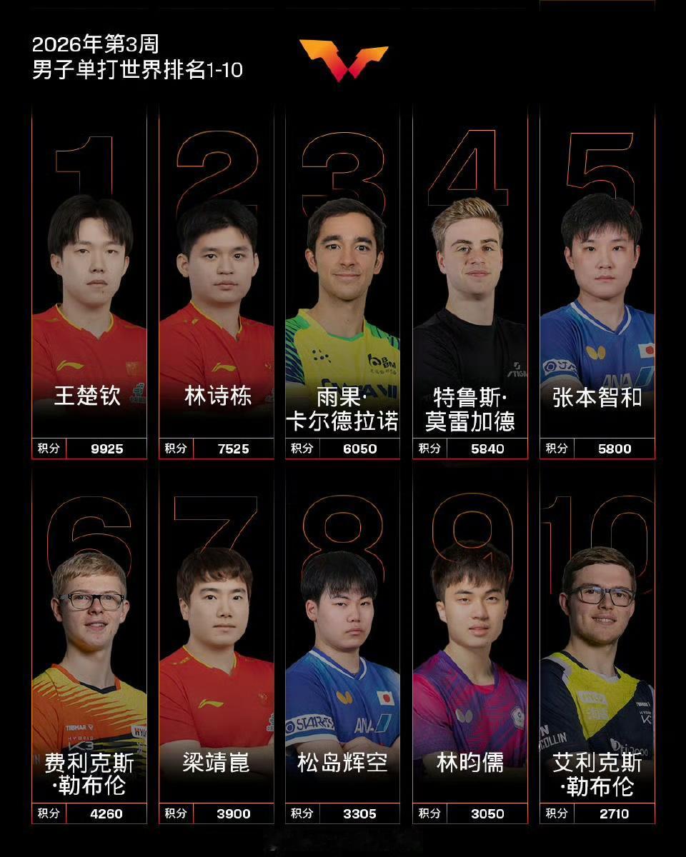 新一周的世界排名孙颖莎和王曼昱依然保持遥遥领先,陈幸同升了一位,蒯曼降了一位,王艺迪降了两位,国乒女队五朵金花阵容已经被朱雨玲成功破阵。 女单前十名国乒队伍占了六个名额,中国澳门选手朱雨玲占了一个名额,其余三位全部是日本队选手,张本美和、伊藤美诚和早田希娜。 男单新的一周世界排名依然是王楚钦和林诗栋霸住前两位,巴西名将雨果·卡尔德拉诺继续保持第三位,莫雷加德升到了第四位,张本智和位立第五。 男单世界排名前十位中国队王楚钦、林诗栋和梁靖崑,中国台湾省队林昀儒,日本队有张本智和和松岛辉空,巴西名将雨果·卡尔德拉诺,瑞典名将莫雷加德,法国勒布伦兄弟,男单方面亚欧排名前十位的名额正逐步持平,男队相对而言竞争力更大,也更难。