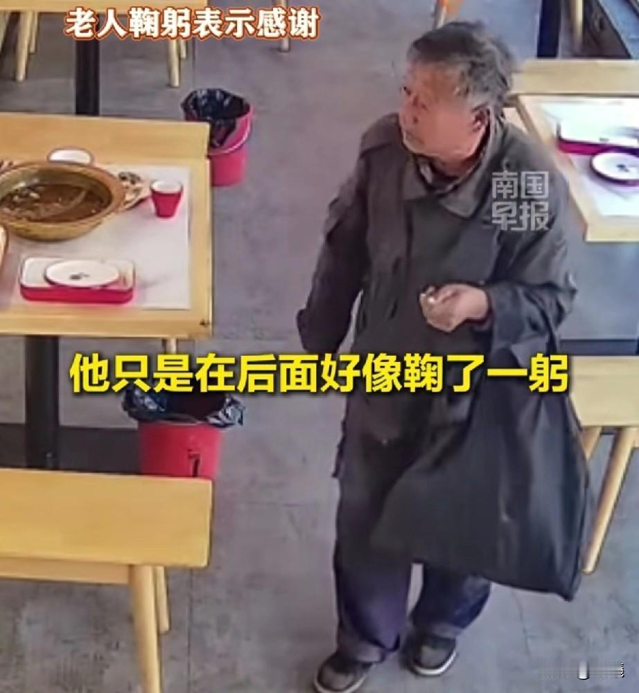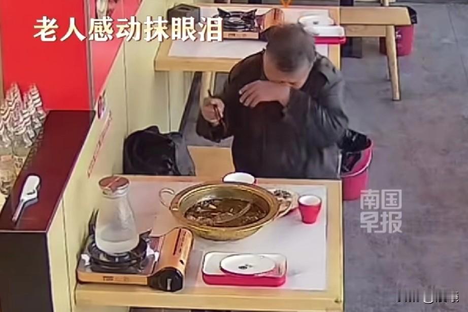 2026年1月10日,山东济南。 寒风凛冽的下午3点左右,山东大门凤火锅鸡店老板程先生正在照顾店里的客人,突然,从外面走进一位颤颤巍巍的老人。 刚进门口,看到店主程先生,他就双手聚在一起,做出乞讨的样子。 突如其来的老人引发程先生好奇,他仔细打量着他:憔悴的面容,干裂的嘴唇,以及一副疲惫的神情。 老人上身穿着一件灰色的上衣,下身一条裤子打了好几个布丁,左胳膊上还夸着个跟衣服差不多的布包。老人一副窘迫的样子,伸出的双手已经冻得发紫。 不过从状态看出,可能老人身体有病。 程先生见老人可怜,问:你要吃饭吗? 满头白发的老人点了点头,说自己路过这里,没有吃饭。 程先生见心头一颤,连忙让他坐到桌旁,迅速从厨房端出一盆菜,对老人说:我们中午也是吃的这种饭。 说完又给老人盛了一碗大米,还倒了热水。 程先生一边递给老人筷子,一边叮嘱老人,如果下次还路过这里,就进来吃饭,不用不好意思,也不用担心客人多,自己开饭馆,有一口热乎饭可以让他吃饱。 老人没有说话,而是颤抖着拿筷子开始吃饭,不过陈先生刚转身,老人就擦已经抑制不住的眼泪。 那泪水是饥寒交迫的慰藉,更是程先生的善意。 视频中,老人的动作让人很难受。 如果不是实在有困难,这么年纪的老人谁愿意这样啊。 店里很忙碌,程先生趁着老人吃饭的功夫,迅速进到厨房忙着。 不光是店里的活多,其实还有一层意思,是程先生不想打扰老人吃饭,更不想让老人觉得难为情罢了。 虽然不知道老人遇到什么难处,但从他的打扮,以及表情就能看出,他是遇到困难了。 很快,老人吃完了饭,他站起来不停地用手擦着眼泪,朝着厨房方向看了看。 程先生仍然在忙,老人可能想感谢程先生吧,但他没有进到厨房,而是朝着厨房的地方,鞠了一个躬,然后颤颤巍巍地走出饭店。 虽然是一顿普通的饭,却给老人冬日里的温暖。一句叮嘱,感动老人的心。 世界破破烂烂,总有人在缝缝补补,正是像程先生这样的人让这个世界充满爱。