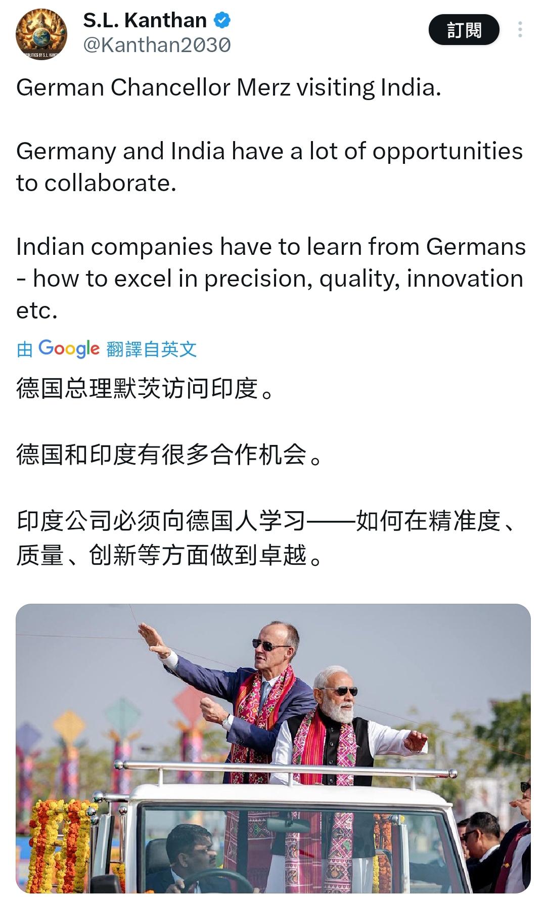 印度欢迎梅尔茨的阵仗很别具一格! 至少跟其他元首到印度进行国事访问的阵仗都不一样,印度果然是对德国另眼相待,德国也果然是最特别的那一个。 梅尔茨高度赞扬印度说:崛起中的印度是我们重要的经济伙伴之一,许多德国企业依赖印度技术工人以及印度市场的活力。因此,我们正加紧努力,争取尽快敲定欧盟-印度的双边贸易协定,这符合我们双方的共同利益。 说得太好了!换作我是老仙,就会说,既然咱们利益那么一致,那就先骗进来再说。 Source: X