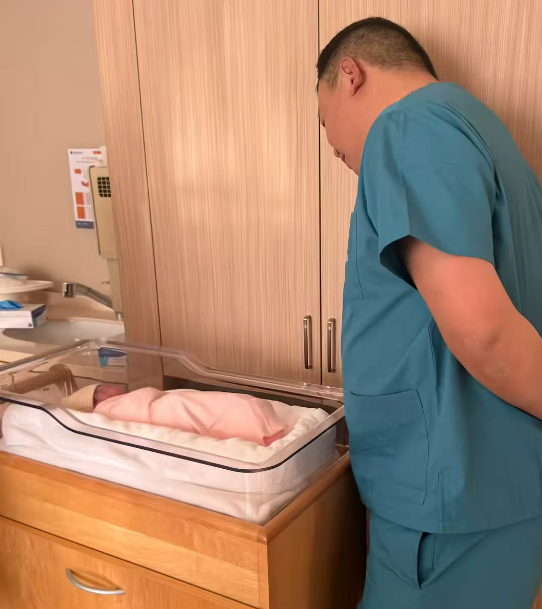 他还陪妻子进了产房;等到孩子出生以后,他静静地站在婴儿床前,久久看着孩子沉睡的模样,似乎暂时屏蔽掉了外界的一切,完全沉浸在“新手爸爸”的激动和幸福里。
