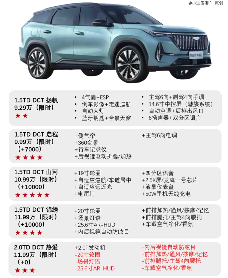 9万就能买吉利新博越L!到底划不划算?如果你在关注10万左右的油车SUV的话 那么小迪很推荐你将吉利博越L放到备选清单里 现在新改款的博越L来了,价格直接拉到9万!~ 小迪赶紧带大家来看看~ 基本参数 车身尺寸:4730/1910/1710(mm) 轴距:2785(mm) 动力系统:1.5T/2.0T+7DCT 百公里油耗:6.85L/7.69L 底盘:前麦弗逊/后多连杆 配置推荐 搞一个超低的价格门槛 已经成为了很多传统车厂的惯例做法 吉利也不例外 限时9.29万的乞丐版只有四气囊,基本不用看 次低配的启程版配置只能算基本够用 所以我们推荐次顶配的山河版 另外限时12万的最高价位配置有两个 一个是1.5T的顶配 另一个是2.0T的高配 如果不差钱的话我们推荐前者 如果预算够又想要2.0T的话 我们更建议直接加钱上星越L~ 你觉得新博越L的性价比怎么样呢? 你会买哪个版本呢? 欢迎积极留言哦~