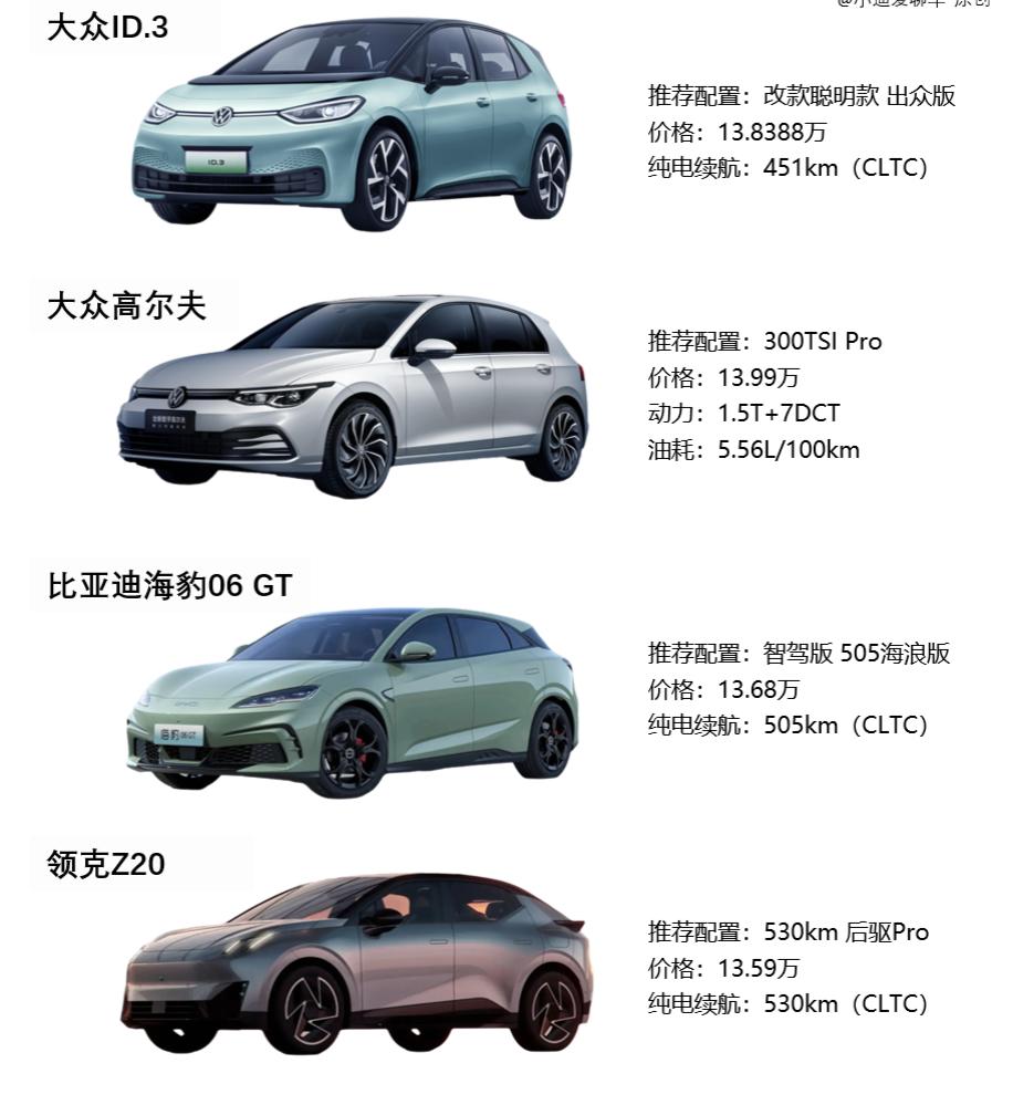 13万预算买小车代步选啥好?看这几个够了 大众ID.3 推荐配置:改款聪明款 出众版 价格:13.8388万 纯电续航:451km(CLTC) 推荐理由:漂亮、舒适、好开、质量口碑好,车机也比老款更好了,值得注意的是原来的聪明款是三元锂电池的,改款之后是磷酸铁锂,要哪种版本可以自己考虑(但原版没有后排出风口) 大众高尔夫 推荐配置:300TSI Pro 价格:13.99万 动力:1.5T+7DCT 油耗:5.56L/100km 推荐理由:榜单里独一份的油车,虽然销量大不如前,但它依然是这个价位里燃油小车的头(ID.3完全可以看作后排更大的电动版高尔夫),除了后排空间捉急之外,如果需要经常跑长途或者其他原因不需要电车的话,直接考虑它就好(或者加两万上姊妹车奥迪A3) 比亚迪海豹06GT 推荐配置:智驾版 505海浪版 价格:13.68万 纯电续航:505km(CLTC) 推荐理由:比亚迪壮大之后“膨胀”了,开始涉足精品小车了~三电平台先进、配置丰富、后排空间和驾驶感受也不错,配置方面直接上最低配就好 领克Z20 推荐配置:530km 后驱Pro 价格:13.59万 纯电续航:530km(CLTC) 推荐理由:四台车里独一份的SUV,擅长操控、配置丰富(有电动尾门和前排加热/通风),设计别致、做工良好,还有魅族车机,只是空间方面表现一般 你最喜欢哪个呢? 欢迎留言哦~