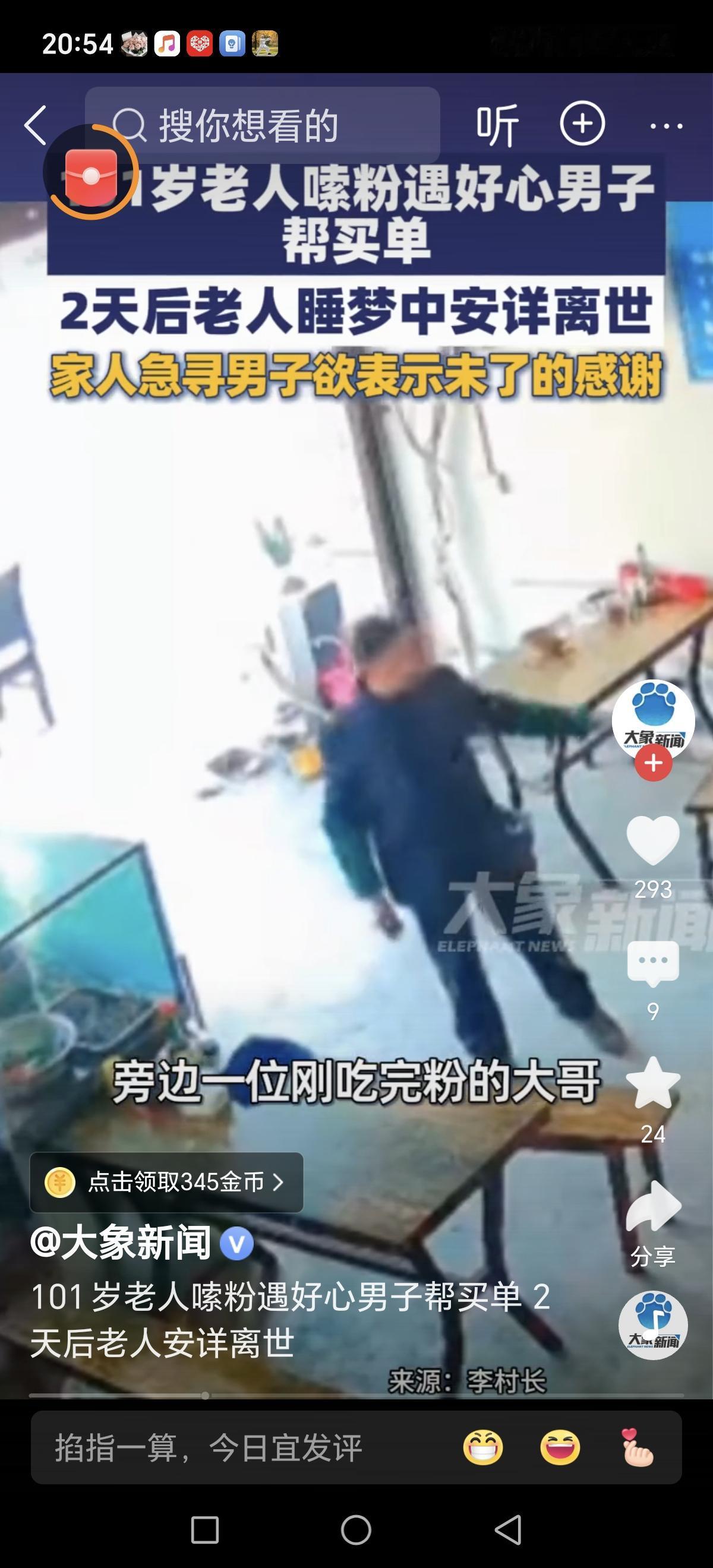 这个故事充满了温暖和感动,也让人深思。101岁的老人,在享用自己喜欢的粉面时,遇到了一位好心男子为他买单。简单的一幕,却在两天后,老人安详离世的背后,折射出生命的珍贵与人间的善意。 老人或许在那一刻感受到了一份来自陌生人的温暖,这份善意带给他一份平静与满足。两天后离开这个世界,似乎也象征着他用一生的积淀,迎来了生命的最后一程。这个故事提醒我们,善良的行为不仅能温暖他人,也可能成为生命中难忘的温暖记忆。 生命的终点或许不可避免,但在有限的时光中,善意与关怀能带来无限的慰藉。老人用他的平静离去,反映出一种对生活的领悟与释然。而那位好心男子的善举,也让我们相信,在这个世界上,总有人愿意伸出援手,用行动传递爱与善良。 这个故事也让我们反思:在日常生活中,哪怕是一份小小的善意,都可能成为他人生命中的光。或许我们无法预知自己的善行会带来怎样的影响,但只要愿意付出,就能让世界变得更加温暖。 愿老人安息,也愿我们都能在生活中多一些善良与关怀,让每一个生命都感受到温暖与尊重。感人心灵的故事
