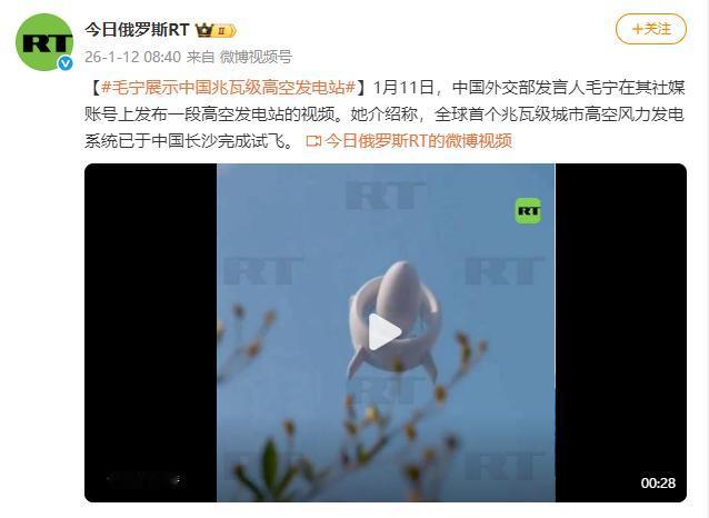 今日俄罗斯RT报道,1月11日,中国外交部发言人毛宁在其社媒账号上发布一段高空发电站的视频。她介绍称,全球首个兆瓦级城市高空风力发电系统已于中国长沙完成试飞。 简单说,就是我们终于把风力发电机“送上了高空”,而且是能适配城市环境的兆瓦级规模,这在全球范围内都是头一次。 毛宁在视频中介绍的这款系统,由长沙湘江新区的研发团队核心攻关,外形虽不像传统风电那样有高大塔筒,却能凭借充氦浮空器升至2000米高空,稳稳捕获高空风能并转化为电能,再通过特制缆线传输到地面。 根据官方数据,它的发电功率足以稳定供应1500户家庭的日常用电,这样的成果,无疑是中国新能源发展史上里程碑式的成就,更是全球高空风能开发的关键一步。 可能有人会疑惑,地面上的风力发电机已经很常见了,为什么还要费大力气把发电系统送到高空?这就不得不说高空风能的独特优势。 我们都知道,地面的风时强时弱、分布不均,很多地方不适合建风电;而距地面几百米以上的高空,风能储量丰裕,风速稳定且常年不断,能量密度更是地面的好几倍。 更关键的是,这款针对城市场景研发的系统,不用占用大量地面空间,也不用建笨重的混凝土基础和大吨位塔筒,相比传统风电能节省40%的材料,发电成本也降低了30%,完全符合城市发展对绿色能源的需求。 之前全球范围内的高空风电研究大多停留在试验阶段,而且多适配戈壁、海岛等偏远场景,能成功研发出适配城市的兆瓦级系统,中国这次的突破确实当之无愧的“全球首创”。 这个“空中发电站”的成功,绝不是一蹴而就的幸运,而是科研团队长期攻坚的成果。 从2024年10月50千瓦级系统首次试飞成功,到2025年1月100千瓦级系统实现突破,再到如今兆瓦级城市系统顺利试飞,短短一年多时间里,研发团队联合国内权威科研机构,相继攻克了浮空器稳定性、轻量化电机、千米级高压输电等一系列难题,一步步实现了技术的迭代升级。 更值得关注的是,这个项目的核心研发中心就设在长沙湘江新区,团队用不到一年时间完成三次关键试飞,用实打实的成绩证明了中国科研的速度与实力。目前,该系统已经启动小批量生产,还和多个沿海城市、高海拔地区签订了意向协议,产业化进程正在稳步推进。 毛宁发布的这段视频,不仅让国内网友倍感自豪,更在海外社交平台引发热议。很多外国网友留言感叹“这简直是未来科技”“中国的新能源技术太让人震撼了”,还有网友对比了各国在高空风电领域的研究历程,感慨中国能把多年前的“科幻构想”变成现实。 中国的科技创新不仅要服务国内发展,更愿意为全球能源转型贡献中国方案。在全球都在追求绿色低碳发展的当下,这样的技术突破,无疑为全球能源结构升级提供了全新思路。