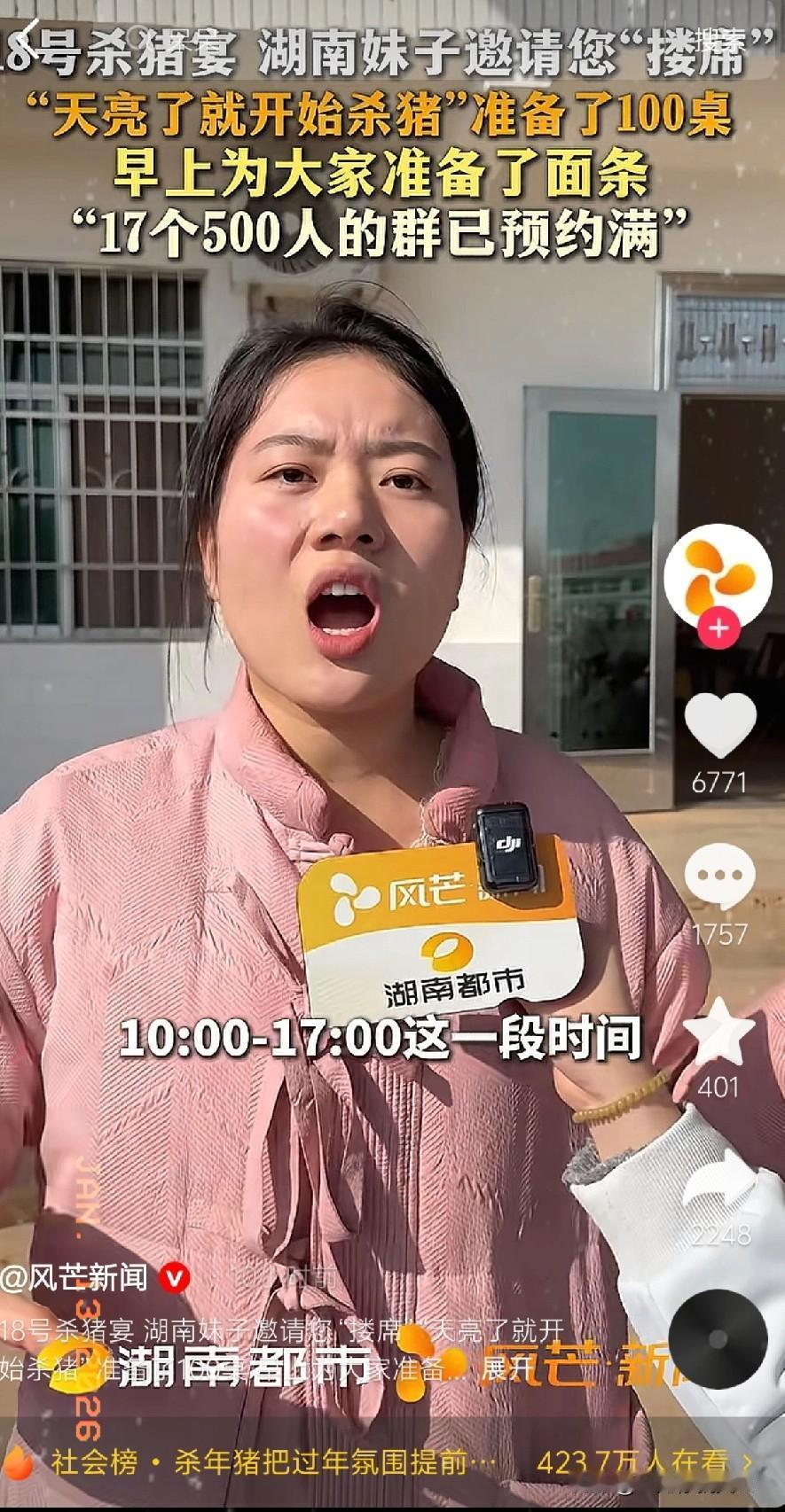 呆呆的杀猪宴彻底结束了, 湖南灿灿却接住了呆呆的流量,原本是18号才会进行,但没想到灿灿的粉丝这么给面子,提前到家里把灿灿围住了,灿灿一看,这可闹大了! 原本灿灿是打算18号才叫朋友来家里吃杀猪饭的,没想到这么多粉丝这么喜欢灿灿,18号都没来,17号就提前上门来找灿灿了,这让灿灿有些措手不及,赶紧提醒其他朋友不要太早来。 没办法,这么多客人上门了,得招待好啊,于是她爸爸直接杀了一只猪给到场的朋友吃。 这两天灿灿的粉丝数量一下涨了五六万,原本微信群里只有几个人,现在已经加满了十几个,看来这下呆呆是坐不住了,搞不好很快就要被灿灿超越了。 也有很多朋友喜欢杀猪宴这种方式,不妨去湖南看看,和四川的杀猪宴有什么不同。