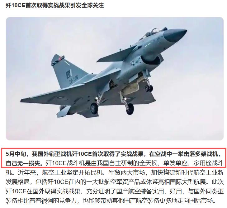 这两天,我最高兴看到的一则消息,就是国家国防科技工业局新闻宣传办公室,官方公布了2025年度国防科技工业十大新闻。 最吸引眼球的,必然就是:5月中旬,我国外销型战机歼10CE首次取得了实战战果,在空战中一举击落多架战机,自己无一损失。 我给大家捋一捋,去年5月中旬,那必然是南亚大陆上的印巴冲突。在那场空战中,巴基斯坦对外宣称击落6架印度战机。赢学印度肯定“死不承认”,还说压根就没这回事。 在击落的战机里面,经川普认证的包括3架“阵风”,1架苏-30MKI、1架米格-29、1架幻影2000战斗机,另外还有一架无人机。巴基斯坦空军零伤亡,可以说是一战定乾坤!