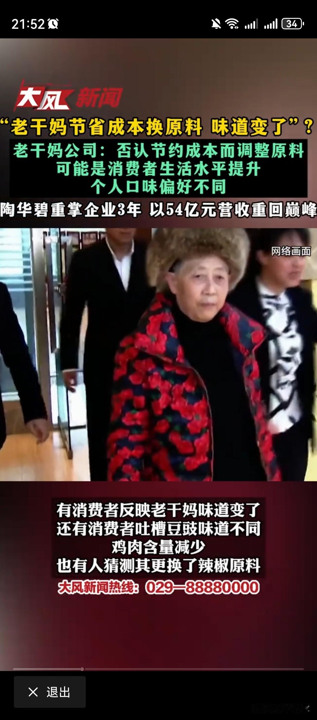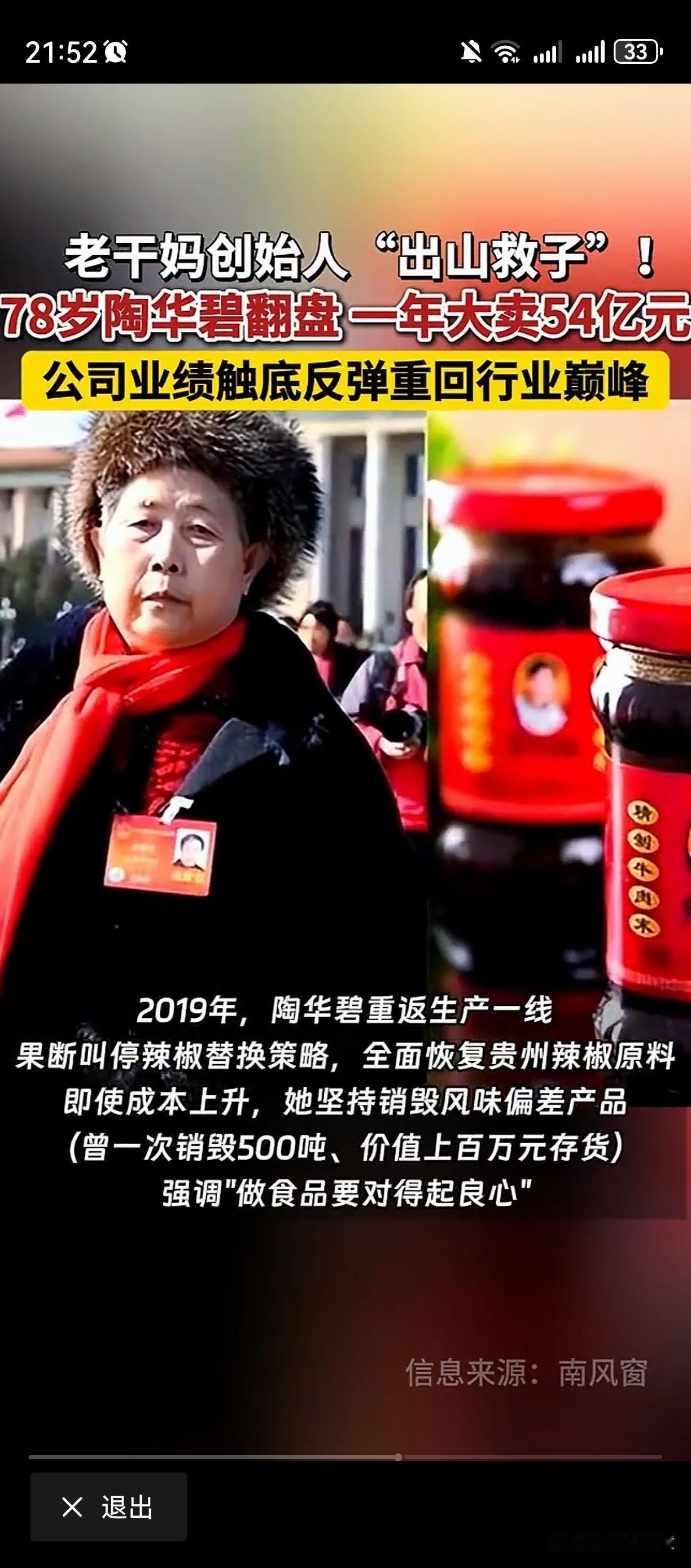 “还得是老干妈” 近日,老干妈又一次上了热搜。 因为老干妈的创始人陶华碧出山执掌公司后,业绩再一次创新高,取得了年营收50多亿的成绩,让这家老品牌再次蓬荜生辉。 可能有人要问了,老干妈不是一直都挺火爆的吗,我们老百姓可是一直都吃,非常不错的辣椒酱,首屈一指的下饭神器。 其实,自从2014年陶华碧退居幕后,把公司交给两个儿子打理后,这家企业就一直在走下坡路,究其原因是因为这儿子为了减少原料成本,把原先使用的贵州辣椒,换成了更便宜的河南辣椒。 虽然河南辣椒一样辣,但是据说生产出来的老干妈辣椒酱味道却变了很多,很多老顾客一尝就知道不是原来的味道了。 还有一个原因,那就是同行的产品竞争激烈,导致老干妈再也不是一家独大,因此销售额连年下滑,已经到了生死攸关的时刻了。 面对如此困境,2019年,将近80岁的陶碧华再次出山,她做的第一件事就是换回原来的贵州辣椒,并且把之前生产的产品全部召回销毁掉,有人惋惜,这些辣椒酱味道差不多,销毁掉很浪费,但是陶碧华却说,做产品一定不要辜负消费者。 第二件事,就是重新使用相对昂贵的贵州辣椒,保证质量的同时,也把产量提高上去,再她这一系列大刀阔斧的整改后,老干妈这家企业再一次取得了辉煌的成绩。 如今,老干妈已经走向正轨,虽然比起前几年有些差距,但在这次教训之后,相信这家企业一定会越来越好。