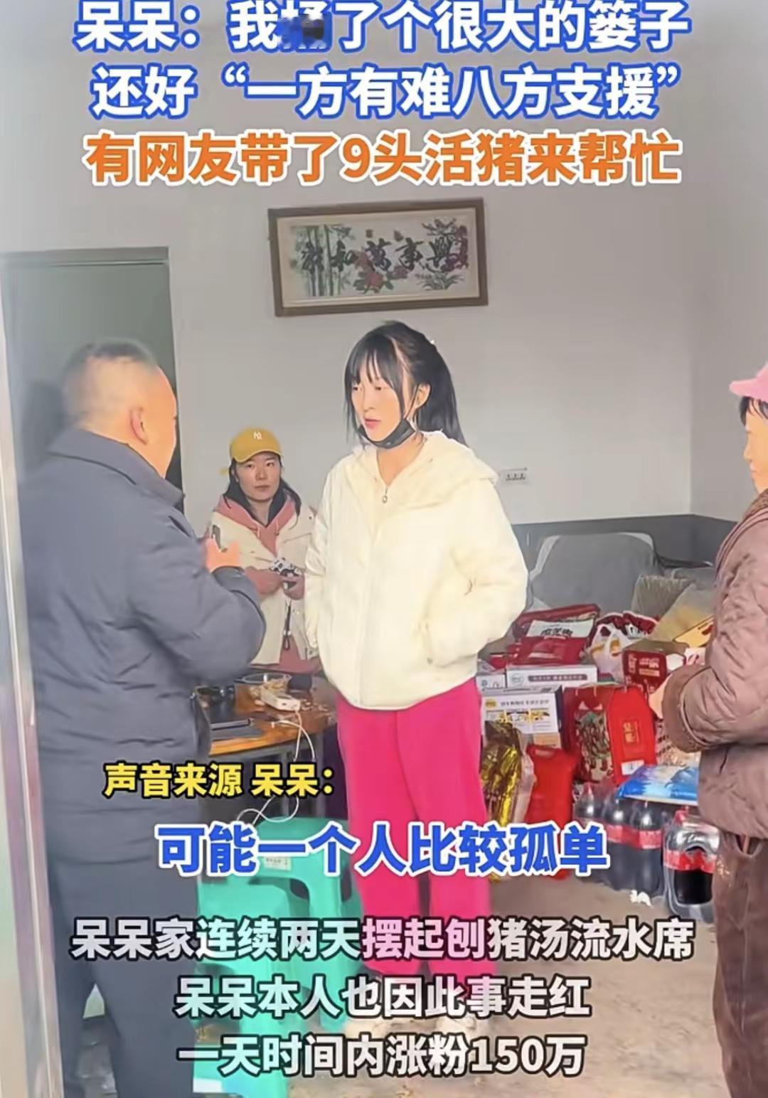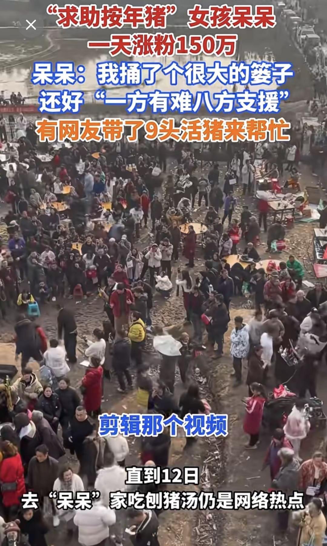 “求助按年猪”女孩呆呆一天涨粉150万,呆呆:我捅了个很大的篓子,还好“一方有难八方支援”;有网友带了9头活猪来帮忙。呆呆 杀年猪了 合川文旅 万万想不到
