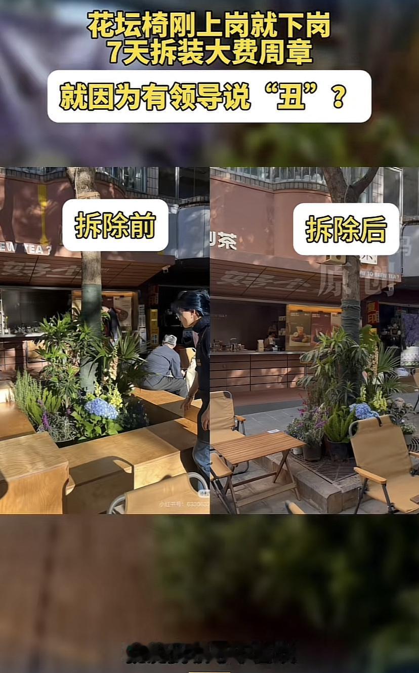 花坛椅刚装上7天就大费周章拆除,只因为领导说太丑了! 事发在云南昆明,这位店主在自己门前设计的花坛事前经过了社区申报,深受消费者和过路人的喜爱,谁都能坐,绝大多数人认为这个花坛里的创意非常的好,当地街道也认为这个椅子设计的非常好,问他能不能改个色,店主也表示同意。 然而到了2026年1月6日,当地街道的一个姓张的负责人说“我的领导觉得这个花坛椅丑”立马对这个花坛椅强制拆除,店主气不过,现在发到网上讨要说法。 各位是怎么看的?欢迎评论区留言。