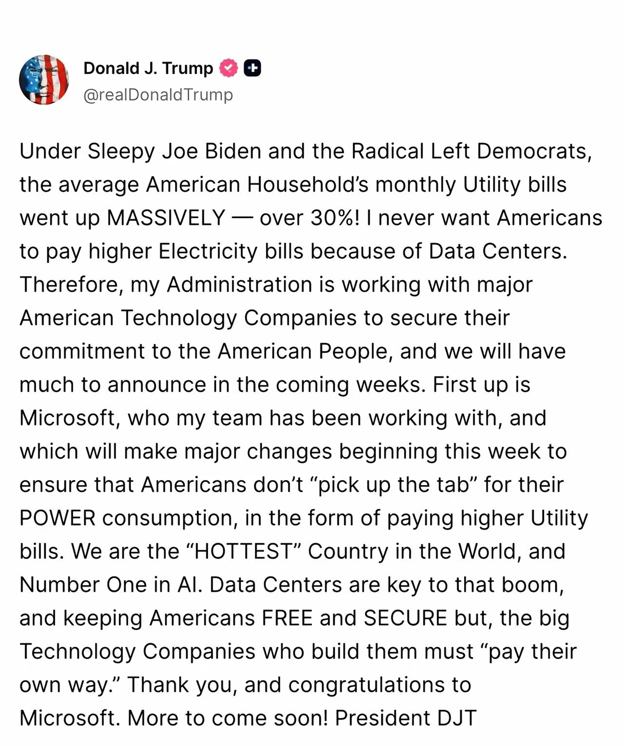 深夜突发大利好!美国AI电力战打响,电力+储能板块要嗨了? 深夜重磅炸场!美国总统特朗普突然发帖官宣:所有美国新建AI数据中心将由科技公司自行供电,绝不让美国人因算力扩张多掏电费,微软已率先响应调整供电方案!这一政策落地,直接点燃美国电力建设“狂飙模式”,电力、变压器、储能等赛道将迎爆发式增长,相关中资龙头有望直接受益! AI的尽头是电力,这话如今已成现实!美国AI数据中心正陷入“算力爆棚但电力告急”的困境:ChatGPT每天耗电超50万度,能生产37吨电解铝;GPT-4一次训练的电能可煮沸1000个奥运标准泳池的水,而美国电网评级仅C+,70%变压器超25年设计寿命,并网等待最长达7年。特朗普新政直接打破僵局,科技巨头纷纷开启“自带发电”浪潮——OpenAI、甲骨文建2.3吉瓦现场电站,xAI用500兆瓦燃气轮机4个月建成超级集群,谷歌绑定875MW光伏电站供电,全美超十家发电设备商斩获单笔超400兆瓦订单。 东吴证券测算,到2030年美国AI算力用电将占总用电量22%,2026-2030年电力需求年复合增长4-5%,而电网供需缺口超70%。这场电力建设盛宴中,三大主线最具爆发力: 1. 变压器赛道:美国电网升级迫在眉睫,高压、超高压变压器需求激增。特变电工早已深耕美国市场,曾攻克欧美企业难以完成的技术难题,向洛杉矶水电局输出核心设备,产品远销60多国,有望直接承接美国电网升级与数据中心自建电厂的巨额订单; 2. 储能赛道:AI用电“脉冲式”波动的特性,让储能成为必备配套,“光伏+储能”更是科技巨头首选方案。宁德时代已与福特合建美国磷酸铁锂电池工厂,凭借CTP技术优势扎根北美,其储能产品将精准匹配数据中心稳定供电需求,分享千亿级市场蛋糕; 3. 电力设备赛道:从燃气轮机到输配电组件,全产业链需求井喷,叠加美国本土产能不足,具备技术积累的中资企业竞争力凸显。 政策东风+供需缺口+技术壁垒,美国电力建设的“黄金周期”已拉开序幕。特变电工的变压器技术、宁德时代的储能实力,均已在海外市场验证,有望成为这场AI电力战中的“中国赢家”。你更看好电力板块哪个细分方向?评论区聊聊你的看法!