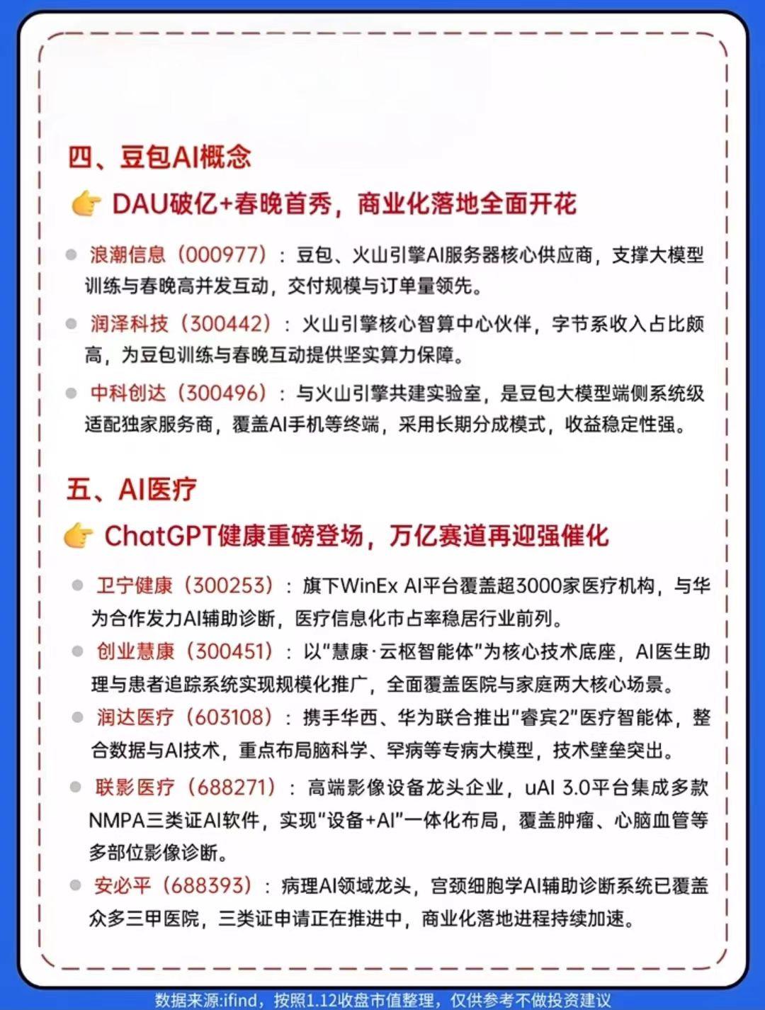 第五届AIGC中国开发者大会(ACDC 2026)将于1月17日在北京召开!六大AI主线核心标的全梳理,从AI营销、智能体到DeepSeek、豆包AI、AI医疗、工业AI,覆盖最具爆发力的赛道! AI医疗概念:卫宁健康、创业慧康凭借医疗信息化平台与AI落地规模领跑医疗信息化AI领域,润达医疗依托专病大模型构筑专科AI技术壁垒,联影医疗以“设备+AI”一体化布局成为医学影像AI龙头… AI智能体概念:昆仑万维凭天工SkyAgents零代码平台降低开发门槛并加速商业化,三六零以“安全+智能体”双轮驱动抢占政务与企业端市场,科大讯飞依托星火大模型实现教育、医疗等多领域智能体规模化落地…… 理财有风险入市需谨慎!