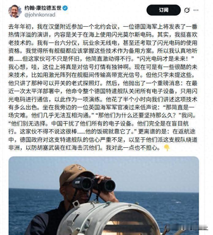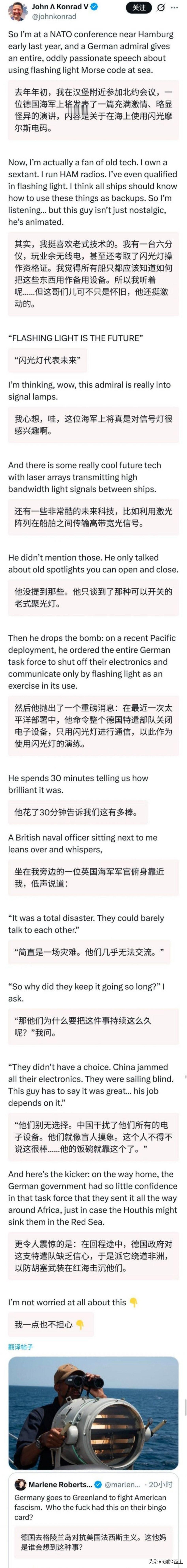 外媒爆料的一个劲爆消息 德国军舰在过航台海的时候遭到强大电子干扰 整只舰队成为了瞎子,最后不得已只能采用灯光通信 查了一下,应该是去年9月份的事,当时德国人派了“巴登·符腾堡”号护卫舰和“法兰克福”号补给舰穿越台湾海峡 由于这次电子战把德国人打怕了,最后从亚洲回国途中,又担心胡塞会把自己击沉,最后不得不走远路绕道好望角回国 更可笑的是,德国人最近还派军舰去格陵兰岛刷存在感,声称要对抗美国的侵略 风停了,雨停了,你又觉得你行了[笑哭][笑哭]