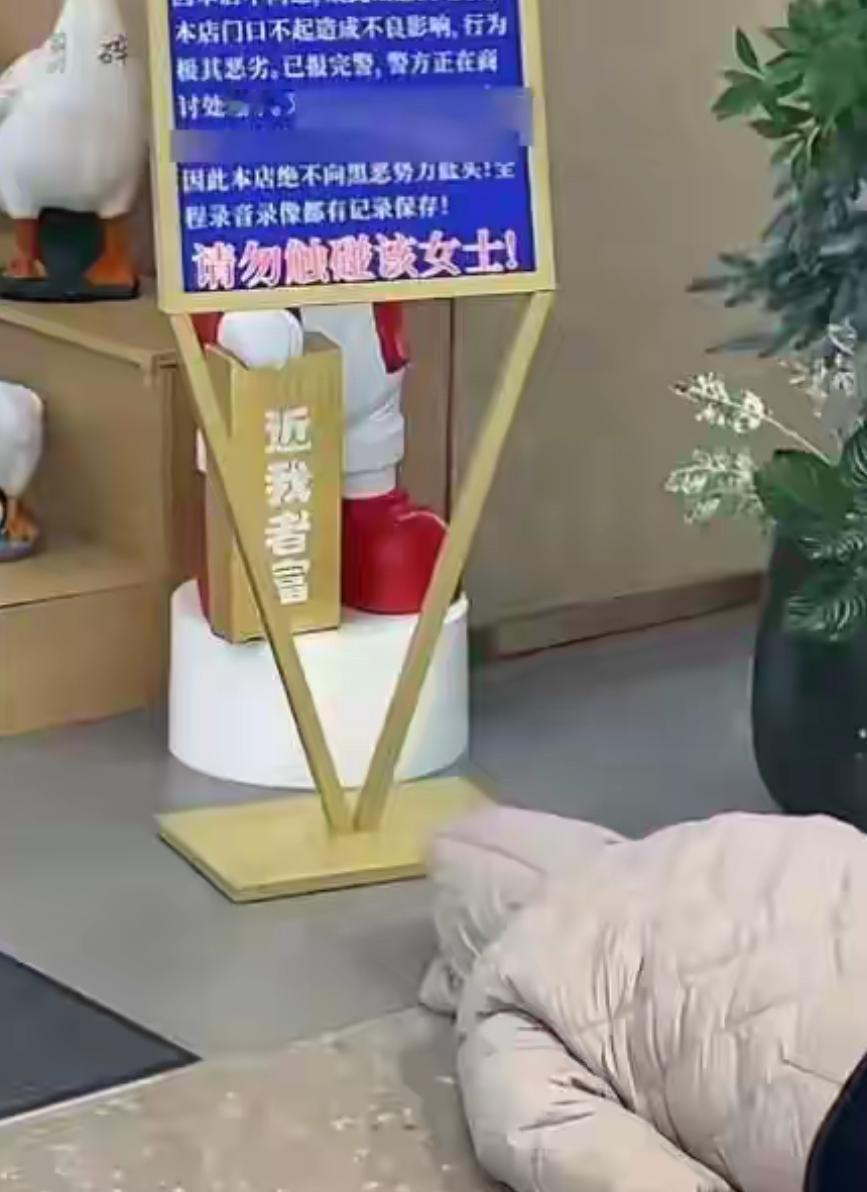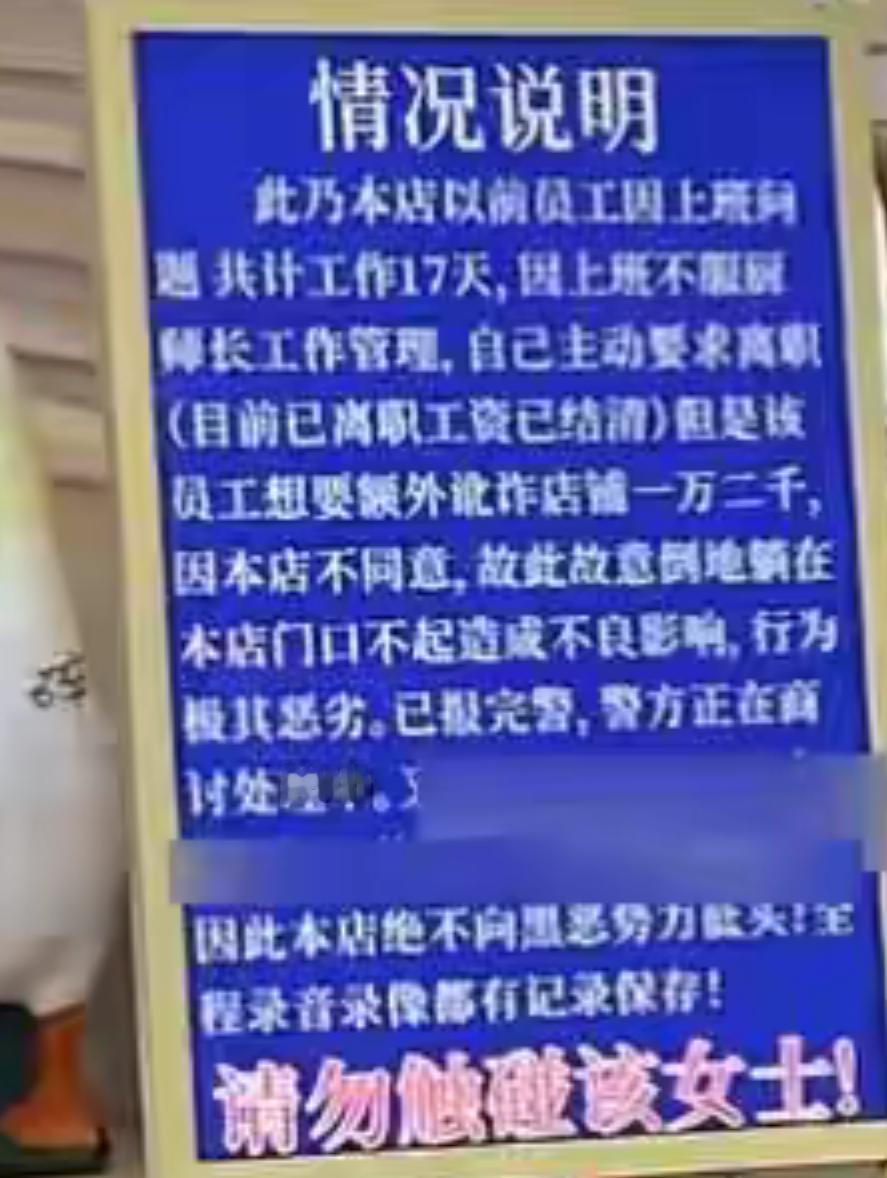 碰到狠人了! 近日,河南商丘一餐馆门前,一大姐躺地上用帽子盖头,躺4天了。 身旁店家立了一块牌子说明情况,原来该女子本是店里的员工,在店里干了17天,工作上不服从管理,主动辞了职。 店里已把其工资结清,不知为何,她索要赔偿金1万2千元,双方未谈拢,于是该女子就做出了此举,谁劝都不好使。 无奈,店家只能立了块牌子说明情况,结尾更是用大体字写着:“请勿触碰该女士”,店家已经报了警,目前对她此举,也没特别好的办法。 开始以为是餐厅宣传搞的行为艺术,大冬天的躺地上多凉,没想到是纠纷,有纠纷走正规渠道,这么闹不仅解决不了问题,还涉嫌违法。 如果有证据证明该人是主动辞职并已结清工资,那这个行为就不属碰瓷,算扰乱公共秩序,完全符合寻衅滋事。 当前多部门和该女子沟通,她就是不说话也不起身,大家说遇到这种情况怎么办,可以强行带离吧? 女子趴餐馆门口地面 商家立提示牌 河南商丘的奇闻