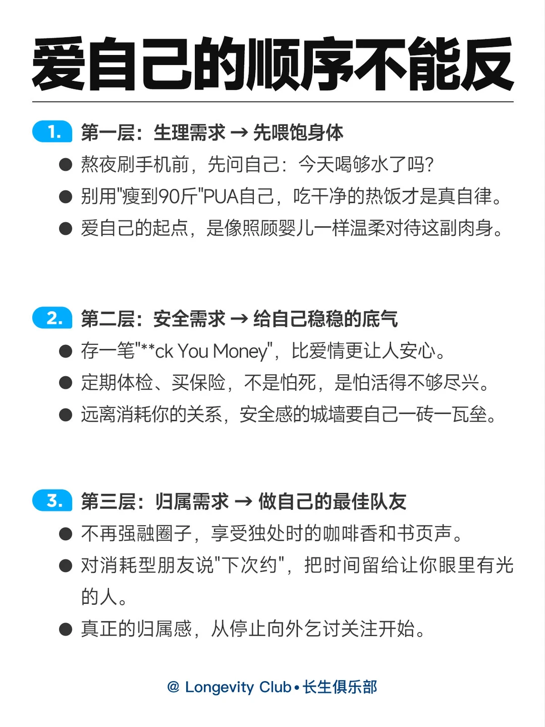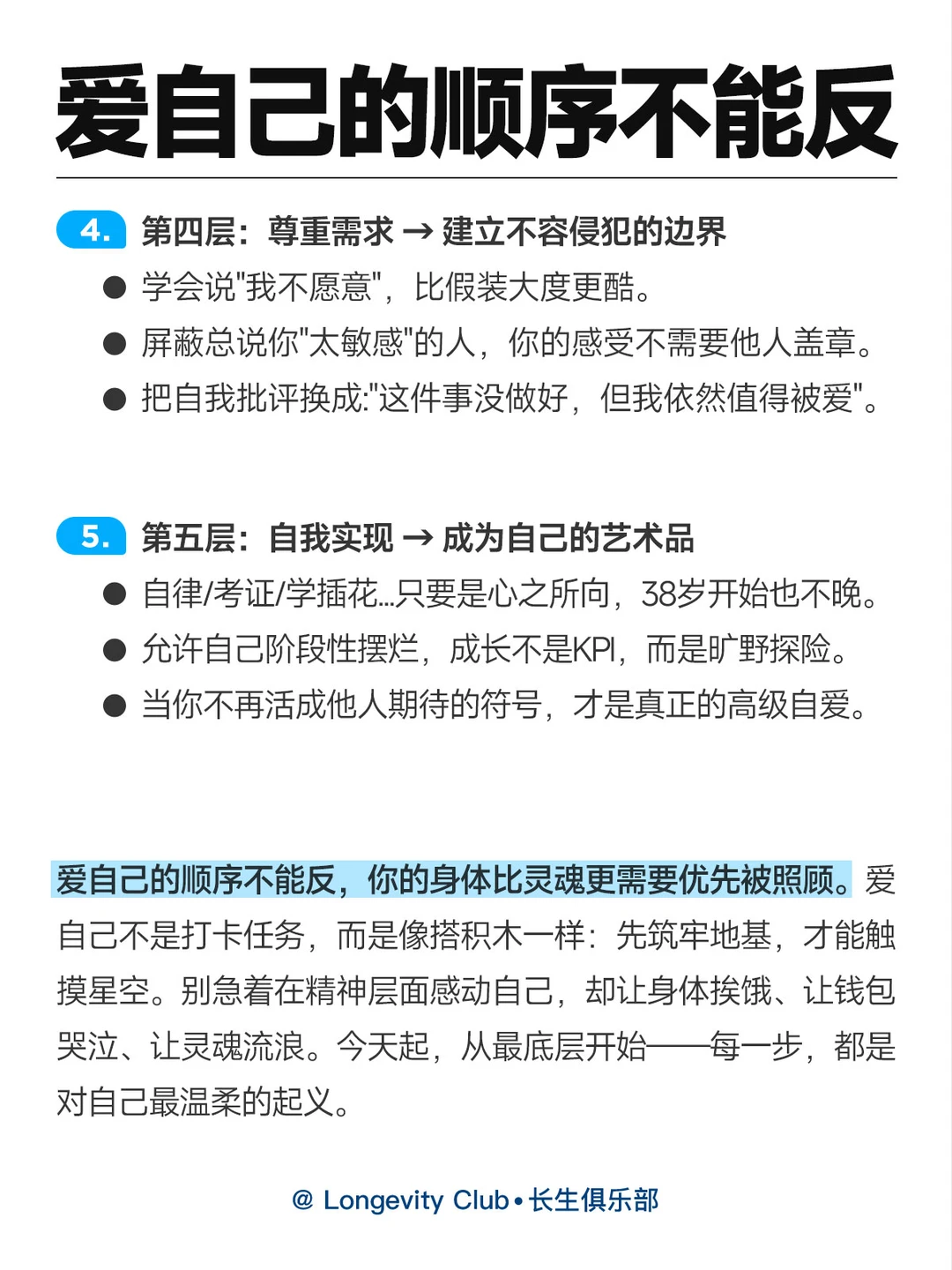 你的身体比灵魂更需要优先被照顾 爱自己不是打卡任务 而是像搭积木一样: 先筑牢地基,才能触摸星空 别急着在精神层面感动自己 却让身体挨饿、让钱包哭泣、让灵魂流浪 今天起从最底层开始 每一步,都是对自己最温柔的起义 女生必看 健康养生 女性成长 马斯洛需求层次论 成长 爱自己 努力成为更好的自己 自律 规划 职场