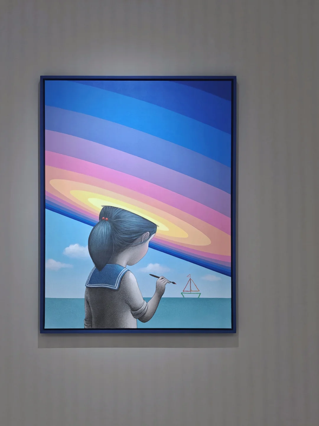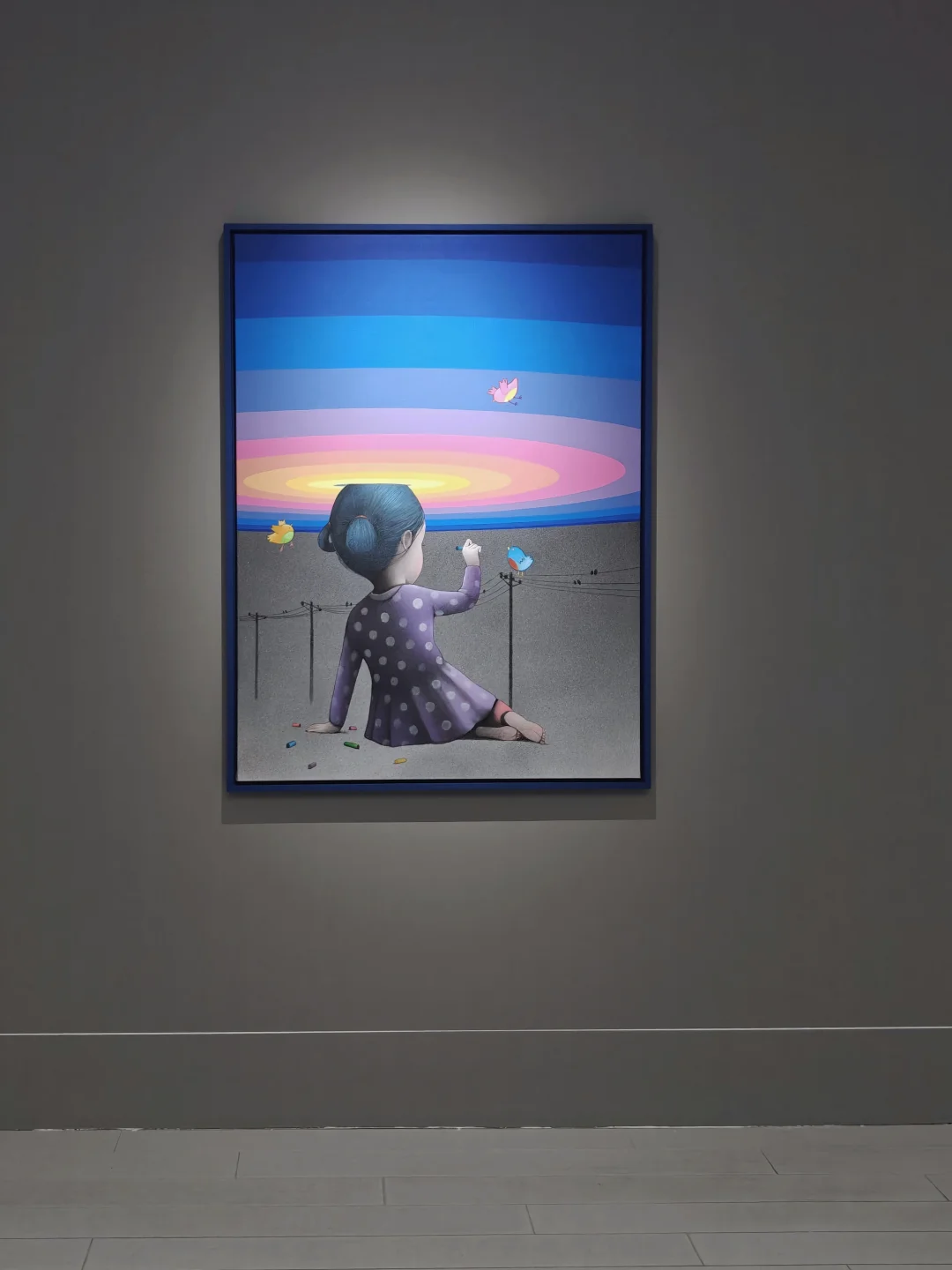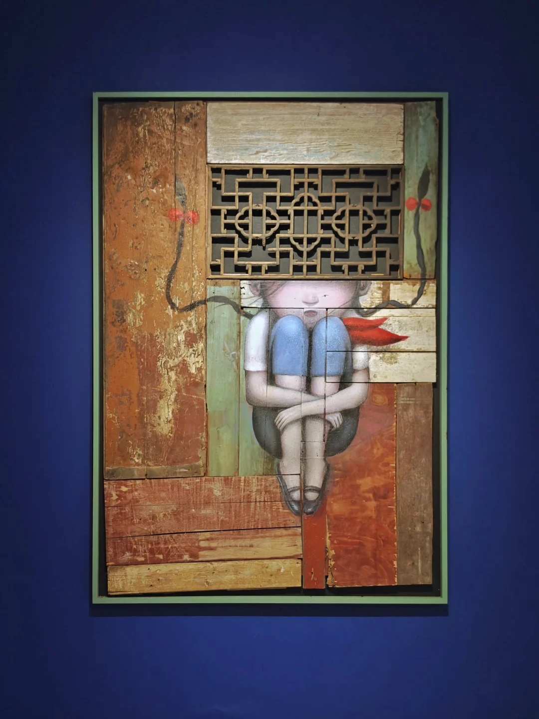 🎈展览空间的黄蓝主色调营造童年晨昏交替的诗意,作品中孩童常出现在斑驳老墙、待拆迁街区等“即将消失的风景”中,形成明亮与忧郁的视觉对比,既温暖又暗含对现实裂缝的敏感,却始终以希望收尾。