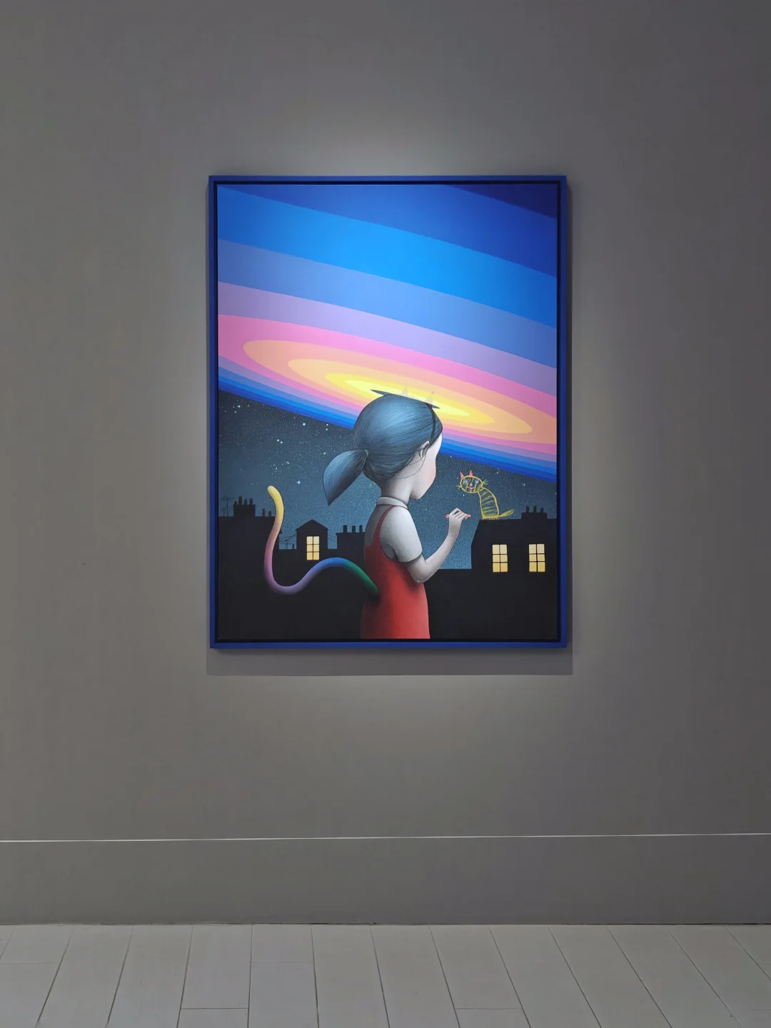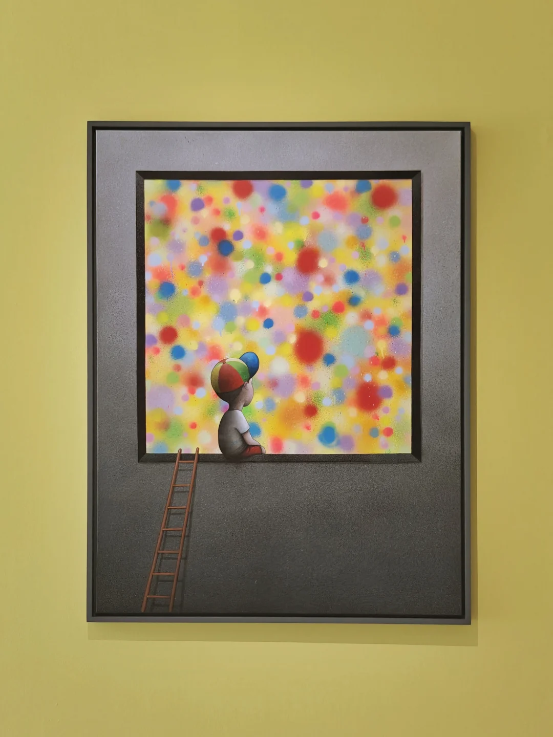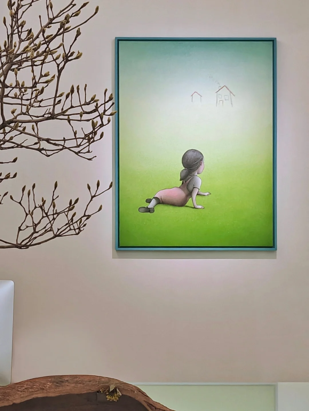 🎈展览空间的黄蓝主色调营造童年晨昏交替的诗意,作品中孩童常出现在斑驳老墙、待拆迁街区等“即将消失的风景”中,形成明亮与忧郁的视觉对比,既温暖又暗含对现实裂缝的敏感,却始终以希望收尾。