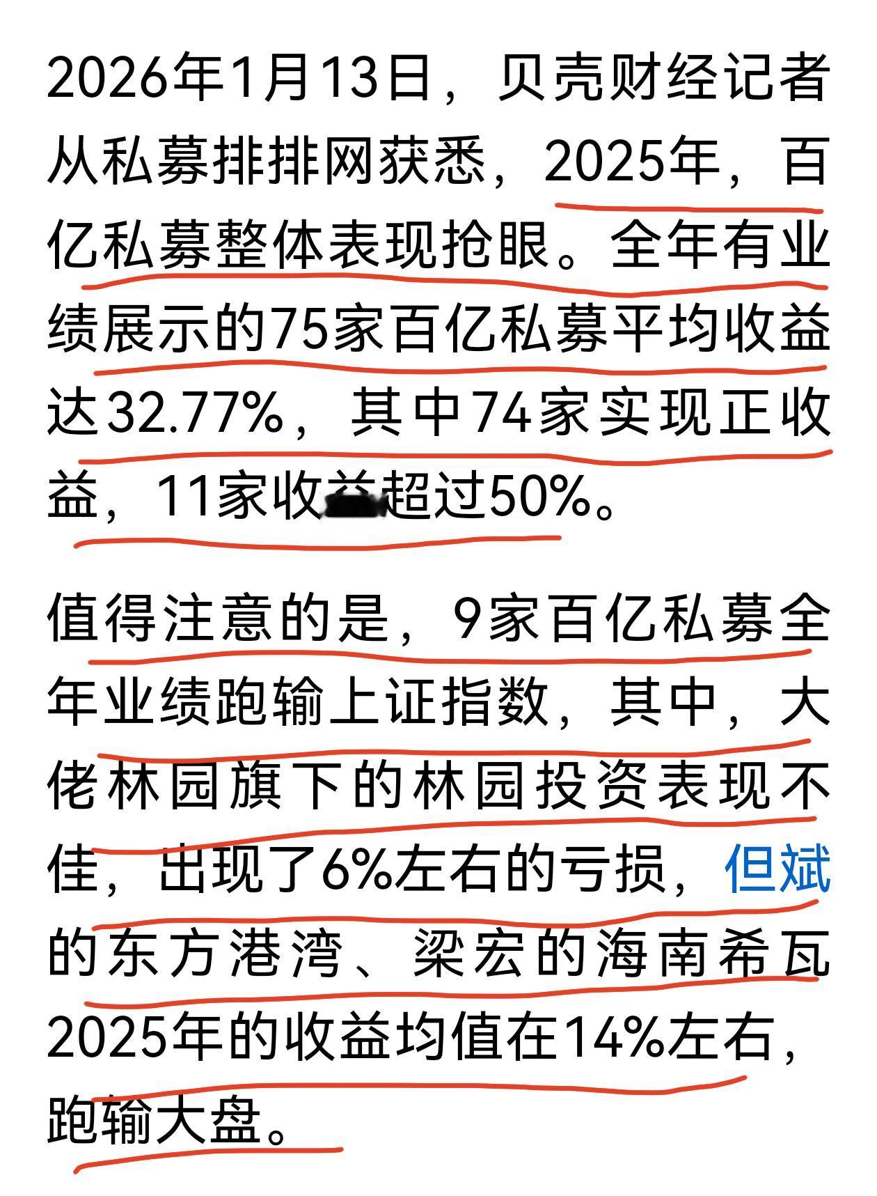2025年100亿私募成绩单出来了: ●75家百亿私募平均收益率32.77%,74家正收益; ●45家百亿量化私募平均收益率37.61%,全部实现正收益; ●23家百亿主观私募平均收益率25.8%,其中22家实现正收益; 牛市带来了投资机会! 量化私募完胜主观私募。昔日的主管私募大佬、价值投资者,林园的林园投资产品亏损6%,但斌的东方港湾产品收益均值在14%左右,跑输了大盘,其海外基金三年业绩不俗,全球排名第三,但其一年的收益率也只有26.63%,低于国内百亿私募收益率均值32.77%,更低于百亿量化私募收益率均值37.61%。 难怪, 但斌感叹:量化投资,在中国“如鱼得水”…… 梁文锋肯定:量化投资正逐渐发展成资本市场的一个新宠,…… 散户茫然:一言难尽,……