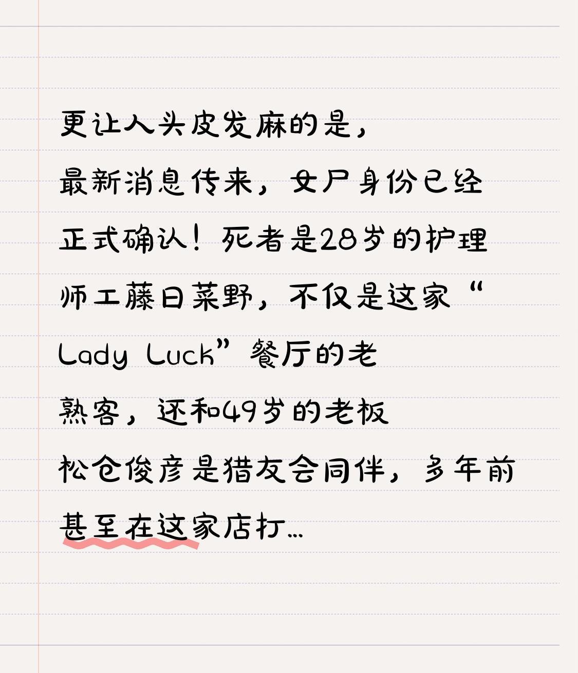 日本餐厅墙壁女尸身份确认 更让人头皮发麻的是,最新消息传来,女尸身份已经正式确认!死者是28岁的护理师工藤日菜野,不仅是这家“Lady Luck”餐厅的老熟客,还和49岁的老板松仓俊彦是猎友会同伴,多年前甚至在这家店打过工,相当于彼此知根知底的熟人 。谁能想到,这份熟络最后竟酿成了灭顶之灾。 案件的转折点更是颠覆认知!警方还原的真相让人不寒而栗:2025年跨年夜当晚,工藤日菜野和松仓俊彦因为金钱借贷问题爆发激烈争吵,情绪失控的老板直接掐住了她的脖子,导致其窒息身亡。杀人后,松仓没有丝毫慌乱,反而淡定地把尸体塞进餐厅二楼墙壁的夹层里,用崭新的胶合板封死,甚至特意开了好几台空气净化机掩盖痕迹。 更恐怖的是,1月2号他就照常开门营业,新年假期里餐厅人来人往,客人在墙壁边喝酒吃饭,压根没察觉隔壁藏着一具尸体。有熟客说,当时只觉得店里光线比平时暗,老板还主动问“有没有闻到怪味”,现在回想起来简直毛骨悚然。而松仓被警方带走问话后,还硬撑了8天,直到1月10号才坦白罪行,警方凿开墙壁时,尸体已经存放了近10天。 更颠覆人性的是凶手的双面人生!在邻居和顾客眼里,松仓是“开朗的好父亲”,每天会花两小时陪孩子逛公园,经营餐厅时还常举办飞镖比赛,口碑一直不错。可谁能想到,这份温和的面具下,藏着如此冷血的恶魔。他利用熟人间的信任行凶,又借着日常经营的掩护藏尸,把餐厅变成了藏污纳垢的罪恶之地。 现在,28岁的护理师永远失去了生命,而那些在餐厅用餐的客人,恐怕一辈子都会有心理阴影。这起案件真的让人警醒:你以为的熟人和善邻,可能藏着不为人知的阴暗;看似烟火气十足的日常场景,背后或许暗藏致命危险。 人心叵测,世事难料,但正义绝不会缺席。目前松仓已因遗弃尸体罪被捕,警方正以杀人罪追加调查,等待他的必将是法律的严惩 。希望这起案件能给所有人提个醒,与人相处多留一份防备,保护好自己和身边人。如果你也觉得脊背发凉,就点赞转发,让更多人看到这个惊悚案件,也为逝去的受害者讨个公道!
