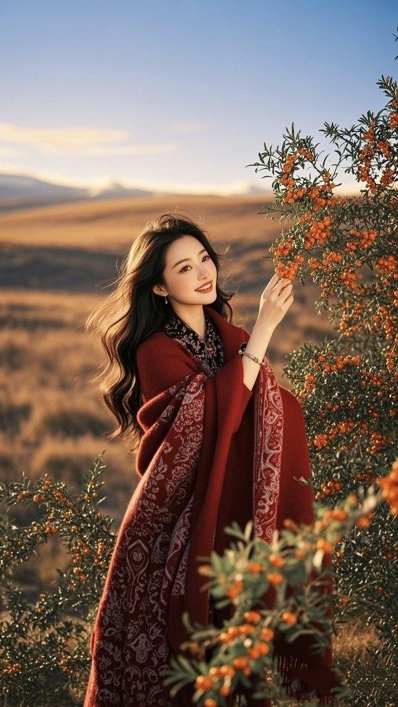 《旷野红妆》 旷野铺展着金色的浪, 她身披赤霞而来, 指尖轻触橙红的浆果, 笑意比落日更明亮。 风掠过发梢, 携着远方草甸的暖, 红袍上的纹样在光里起伏, 像凝固的火焰在流淌。 远山在天际铺成淡墨, 浆果的甜香漫过衣裳, 她抬手的瞬间, 岁月都为这温柔停航。 赏析:这首诗以“红”与“金”为主色调,将人物与旷野的辽阔背景相呼应。“身披赤霞而来”既点明了红袍的明艳,也让人物出场自带诗意的仪式感。 “指尖轻触橙红的浆果”捕捉了画面里的温柔动作,而“笑意比落日更明亮”则用对比强化了笑容的感染力。 “红袍上的纹样在光里起伏,像凝固的火焰在流淌”一句,让静态的织物有了流动的生命力,也呼应了旷野的风。 结尾“岁月都为这温柔停航”,用略带浪漫的想象,将画面里悠然舒展的氛围推向了更悠长的意境。 淡抹红妆 红妆写真图 红妆图 秋日红妆 红妆倚苇 红妆诗韵 文豪红妆
