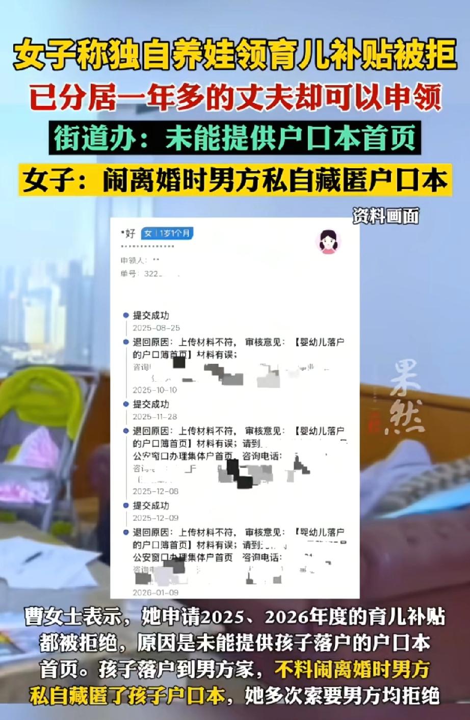 真的要被这渣男气死! 苏州曹女士跟丈夫分居一年多, 打离婚官司也有段时间了, 这期间丈夫没给孩子花过一分钱, 没带过一天娃, 转头却把户口本首页藏起来! 自己去申请育儿补助! 曹女士就因为拿不出户口本首页,育儿补贴直接被拒。 规定里要户口本首页是硬要求,可也不能不管证件被藏的情况吧?真正累死累活养娃的领不到,啥也不管的渣男倒能拿,曹女士的委屈该找谁去说?